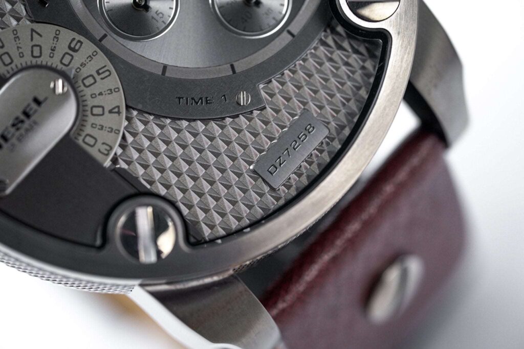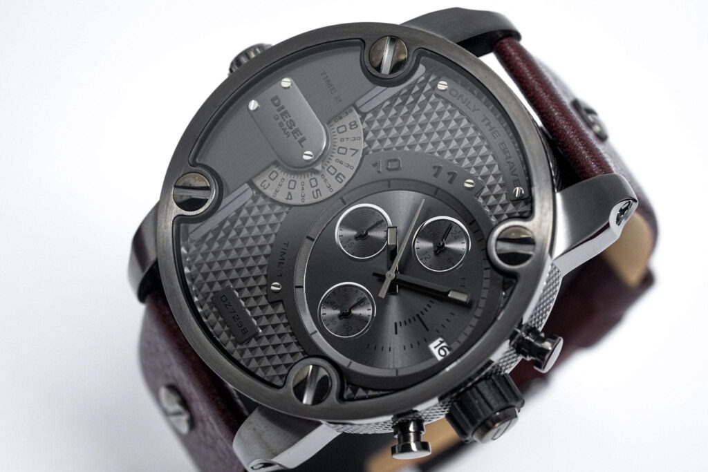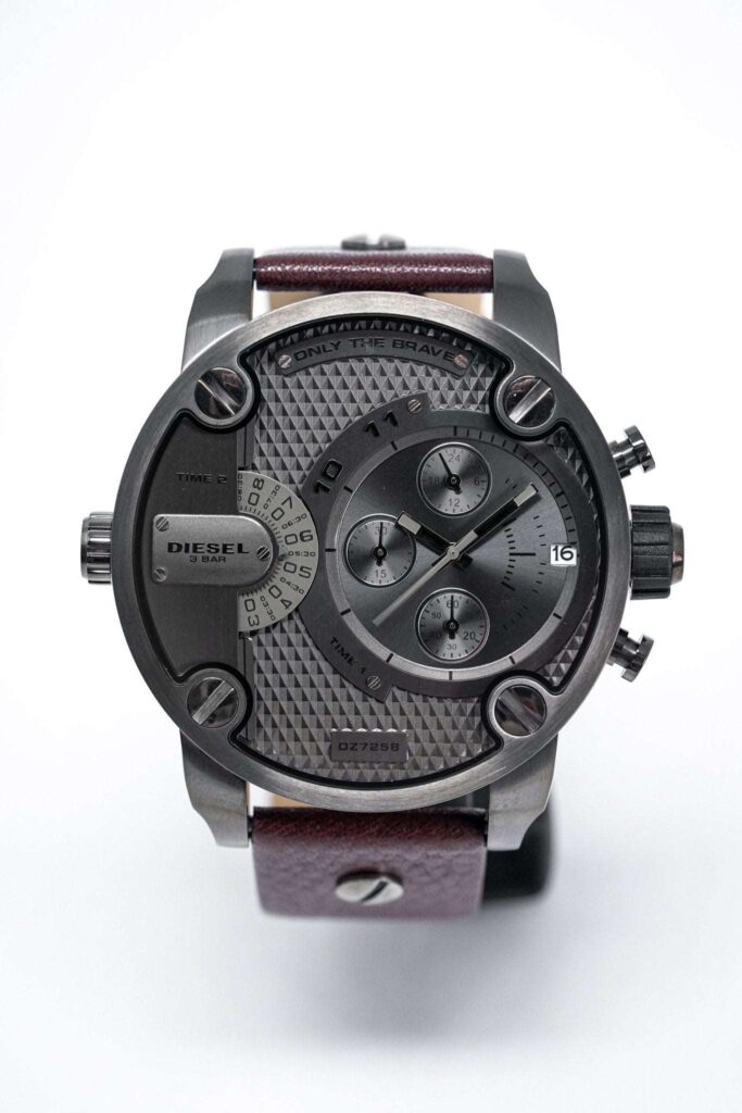 Die Diesel DZ7258 besticht durch ihr robustes 51-mm-Edelstahlgehäuse und ein elegantes schwarzes Zifferblatt mit zwei Zeitzonenanzeigen und Chronographen-Hilfszifferblättern. Angetrieben wird die Uhr von einem zuverlässigen Quarzwerk, das für präzise Zeitmessung sorgt. Dank ihrer Wasserdichtigkeit bis 30 Meter ist sie alltagstauglich.