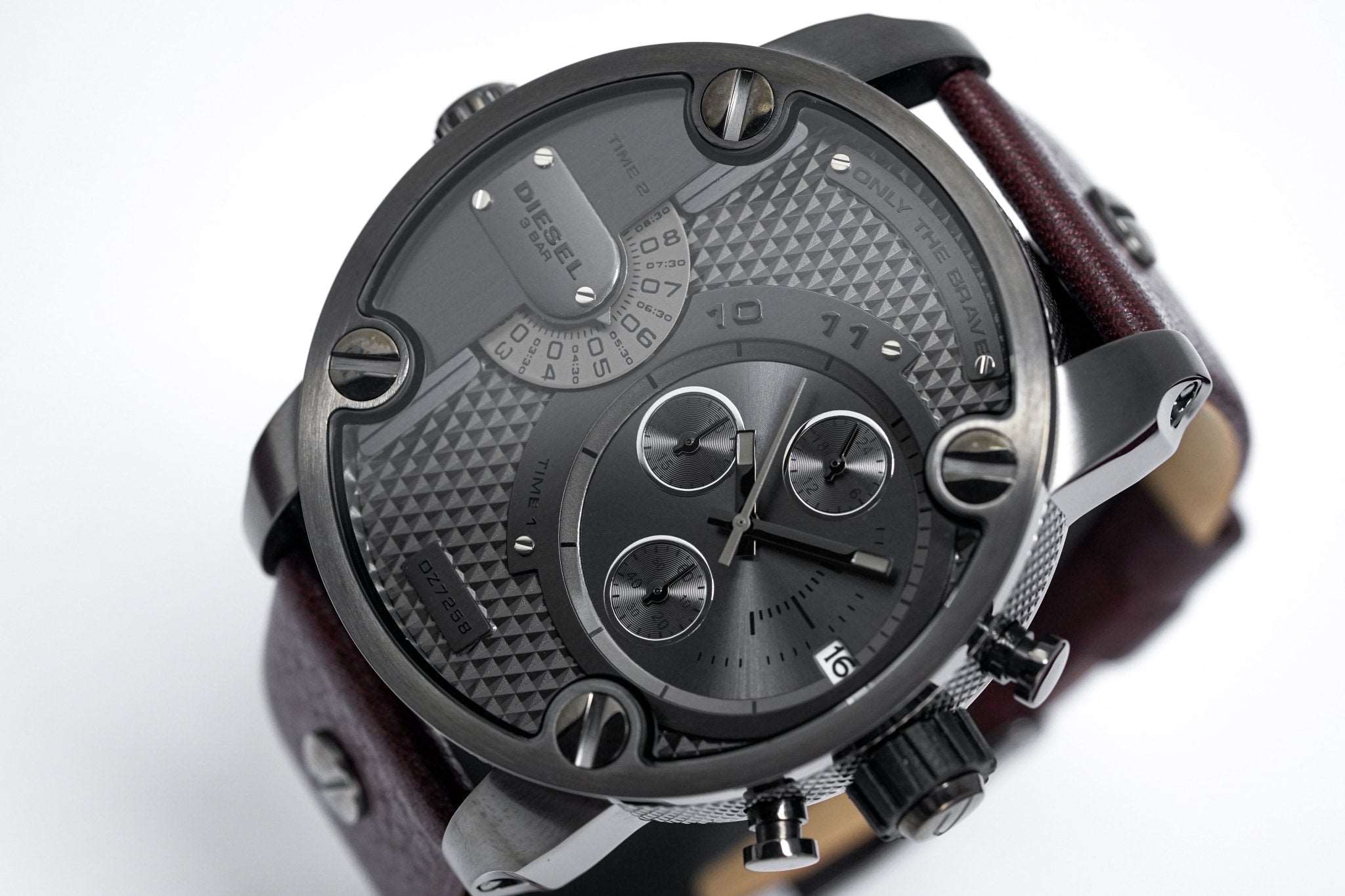 Diesel DZ7258: 51-mm-Edelstahlgehäuse, schwarzes Zifferblatt, Anzeige zweier Zeitzonen, Chronographenfunktion, Quarzwerk, wasserdicht bis 30 m. Markantes und unverwechselbares Design für jeden Anlass. Diese markante Uhr verkörpert den einzigartigen und robusten Stil von Diesel und ist somit ein herausragendes Accessoire für legere und formelle Outfits.