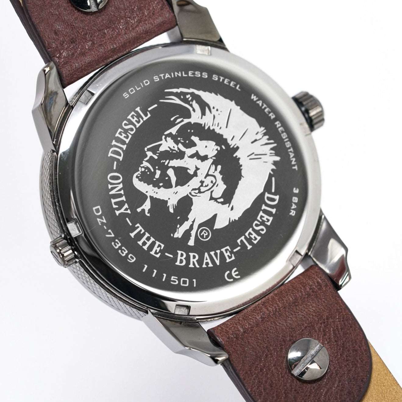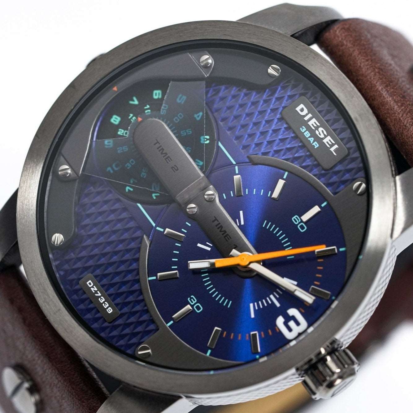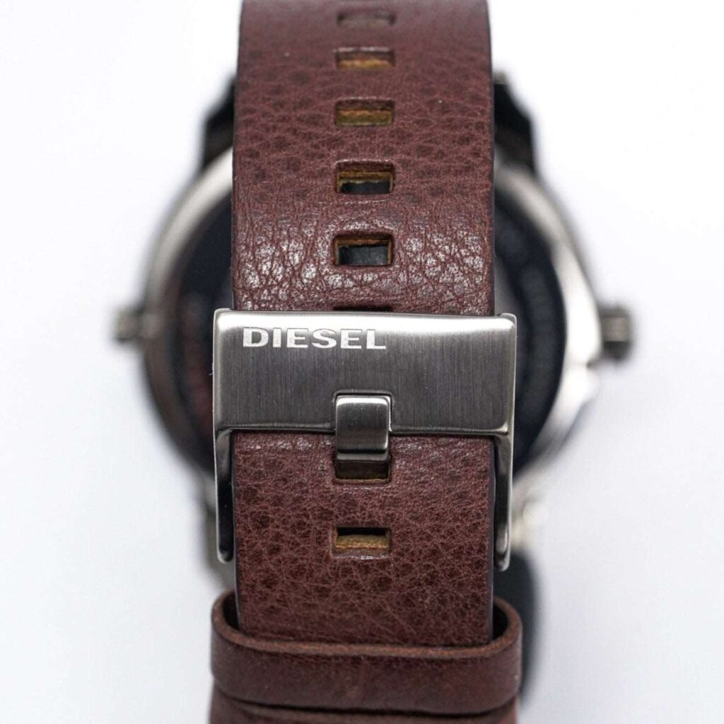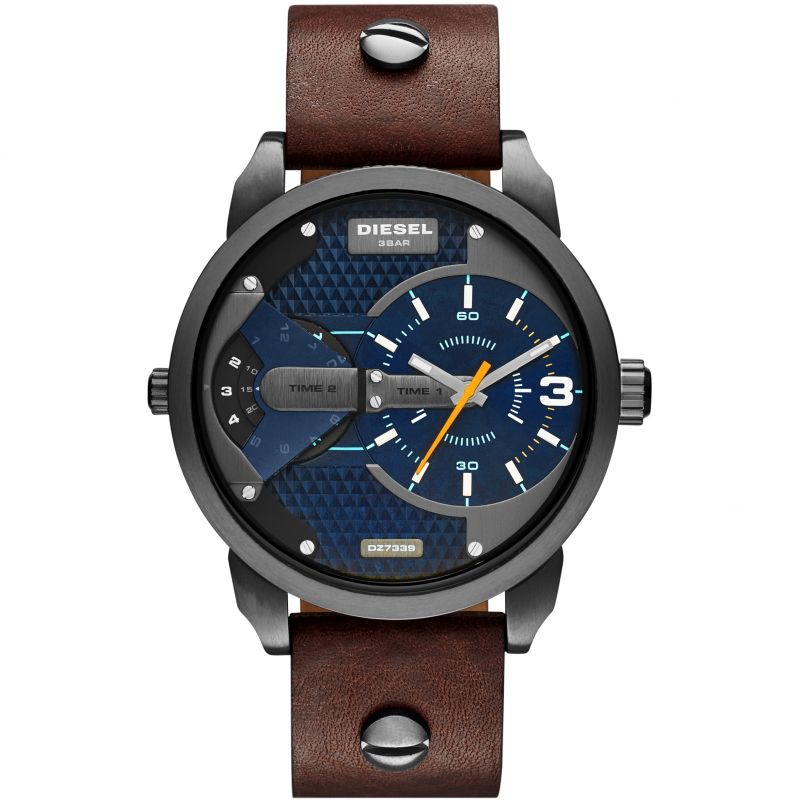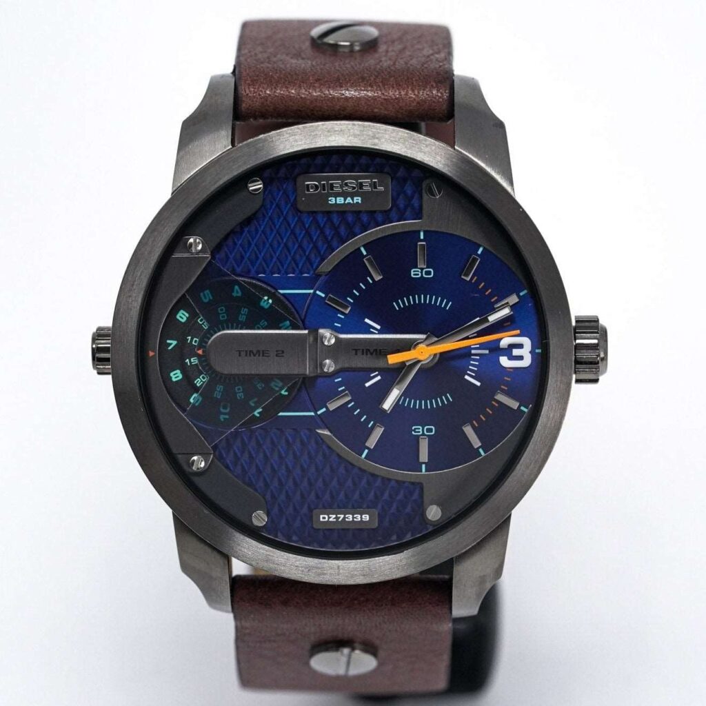 Diesel DZ7339: 57mm stainless steel case, black dial, dual time zone display, chronograph functionality, quartz movement, 30m water resistance. Bold and versatile design for any occasion. This striking timepiece embodies Diesel’s distinctive and rugged style, making it a standout accessory for both casual and formal wear.