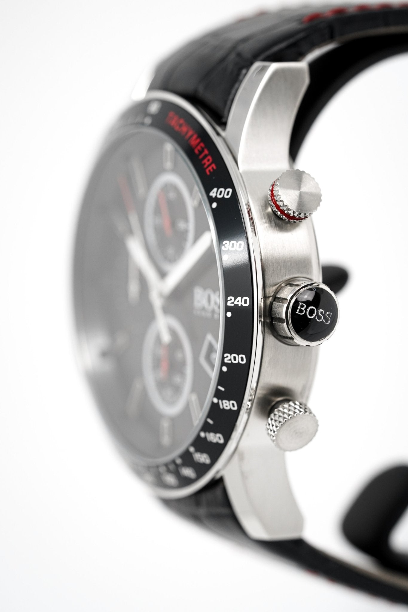 44mm Stainless Steel Case. Scratch Resistant Mineral Crystal. Tachymeter Bezel.