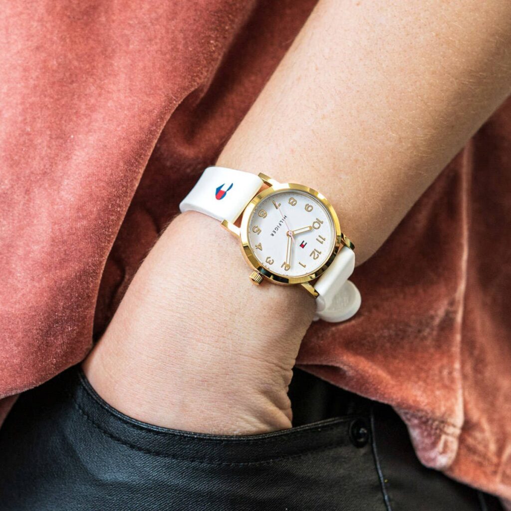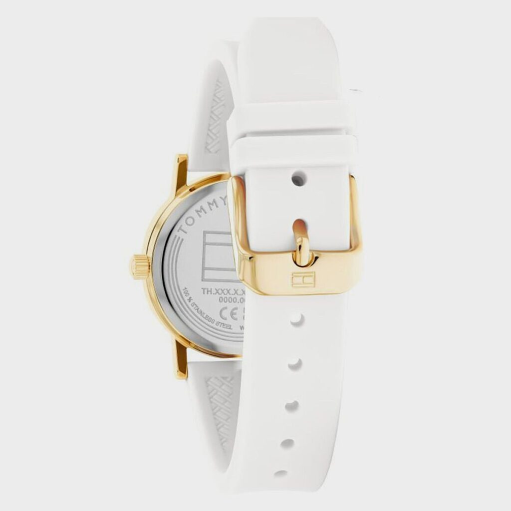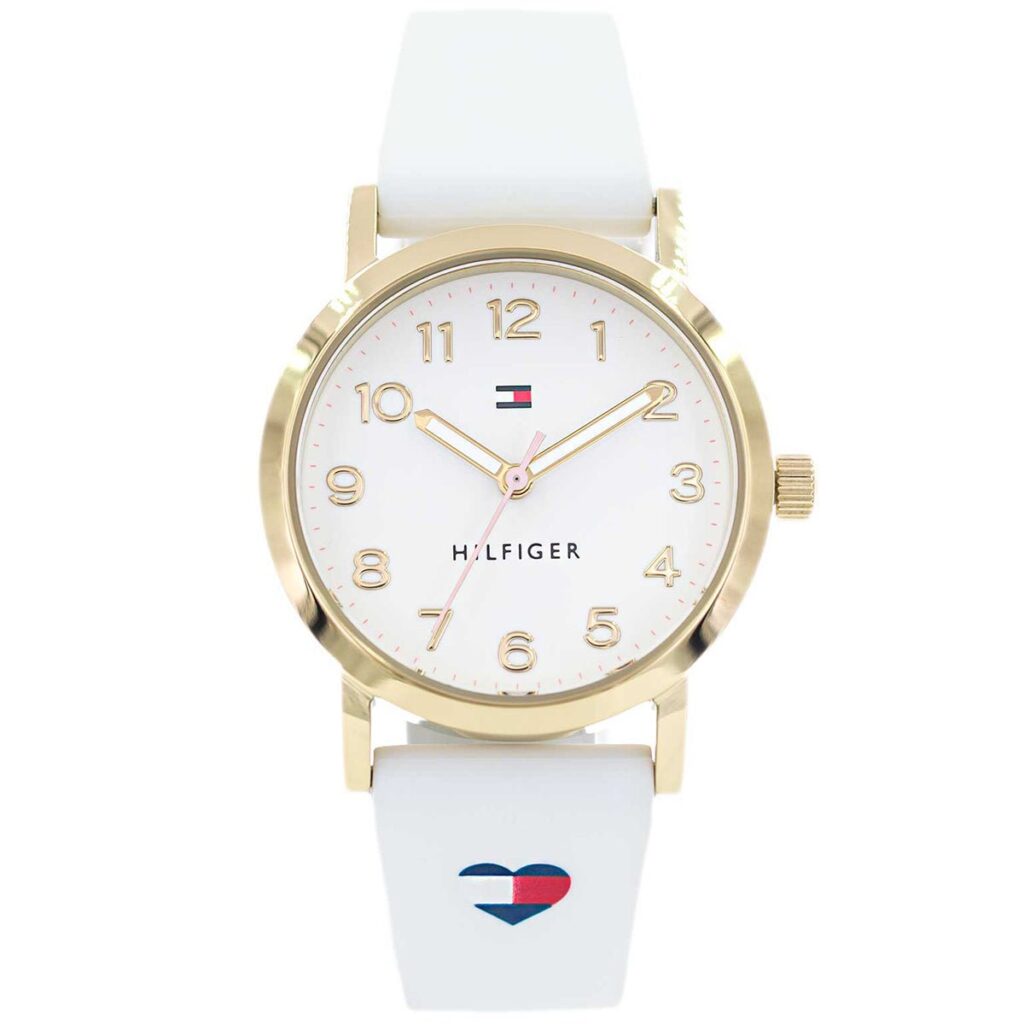 Tommy Hilfiger Mädchenuhr aus der Girls Communion Kollektion, gefertigt aus Edelstahl und Silikon. Diese elegante und attraktive Uhr besticht durch ihr weißes Gehäuse (32 mm Durchmesser), das mit einem weißen Zifferblatt, weißen Indizes und Zeigern ausgestattet ist. Das analoge Quarzwerk wird von Mineralglas geschützt. Das weiße Kautschukarmband ziert ein Herz in den Tommy Hilfiger Farben. Die Uhr verfügt über eine Dornschließe und ist bis 3 ATM wasserdicht.