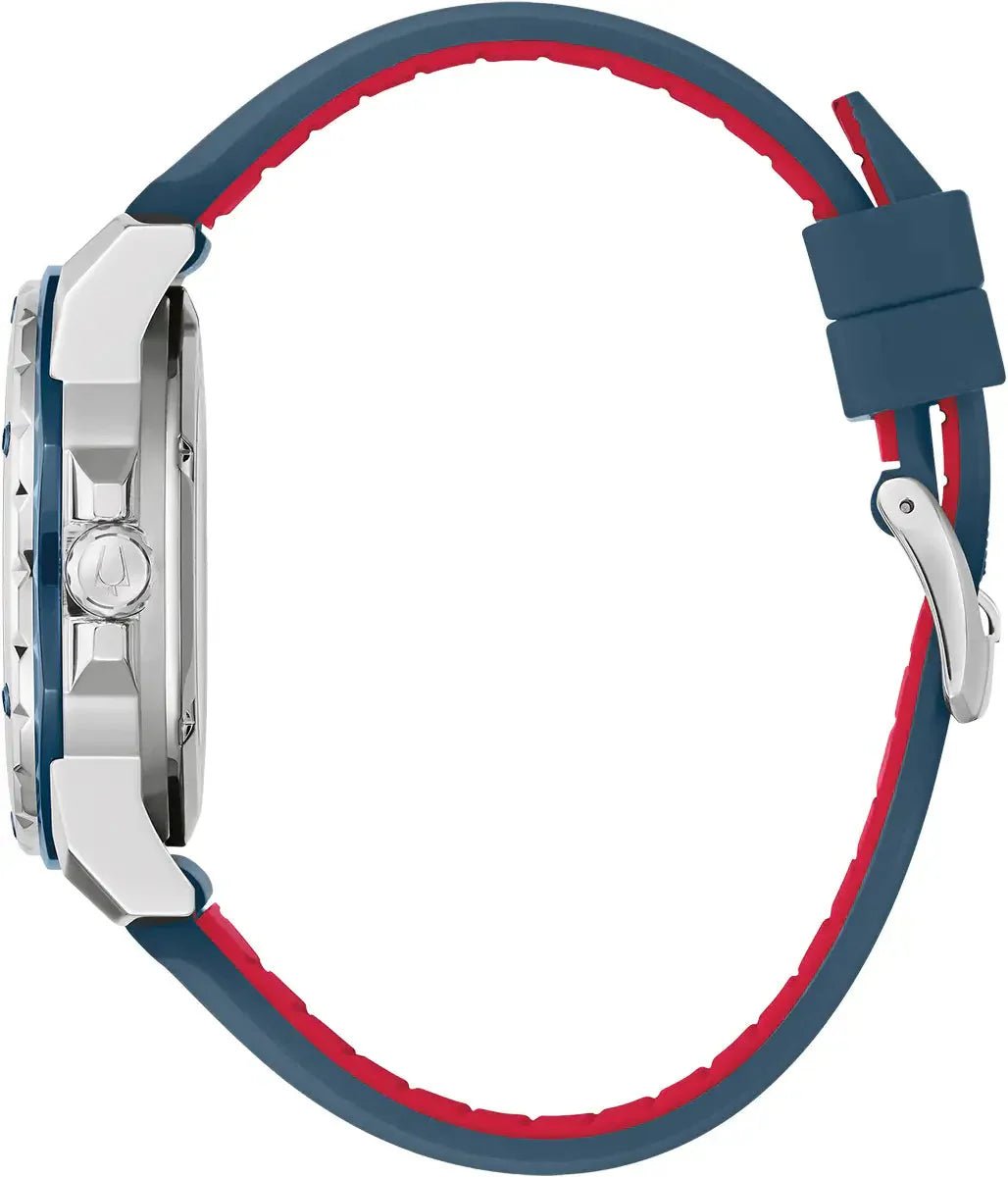 The Bulova Marine Star men’s watch is a classic timepiece with a legacy stretching back decades. The open heartbeat automatic 21-jewel movement is showcased in the dial aperture and in the exhibition case back. Featuring a stainless steel case paired with a blue dial with rose gold-tone accents and flat mineral crystal. The blue textured silicone strap has a contrasting red underside, and the watch is water resistant to 200 metres, living up to its name as a timepiece that can go wherever you do without missing a beat.