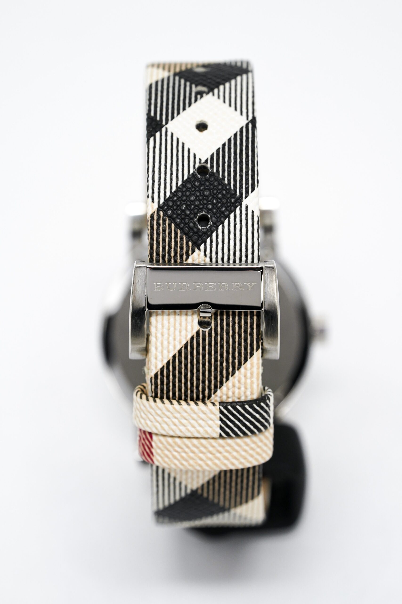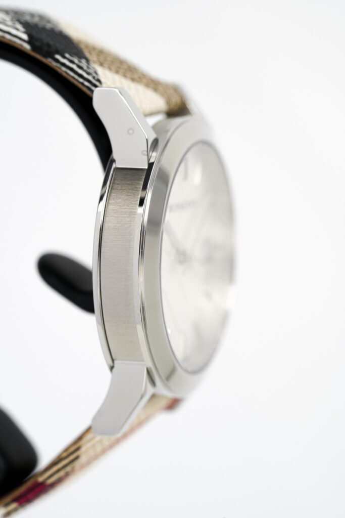 The silver dial is adorned with Burberry’s signature check pattern, complemented by silver-tone hands and index hour markers for a refined and elegant look. A date display is conveniently positioned at the 3 o’clock mark.