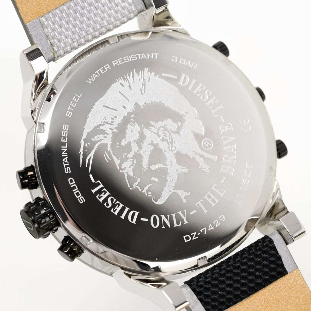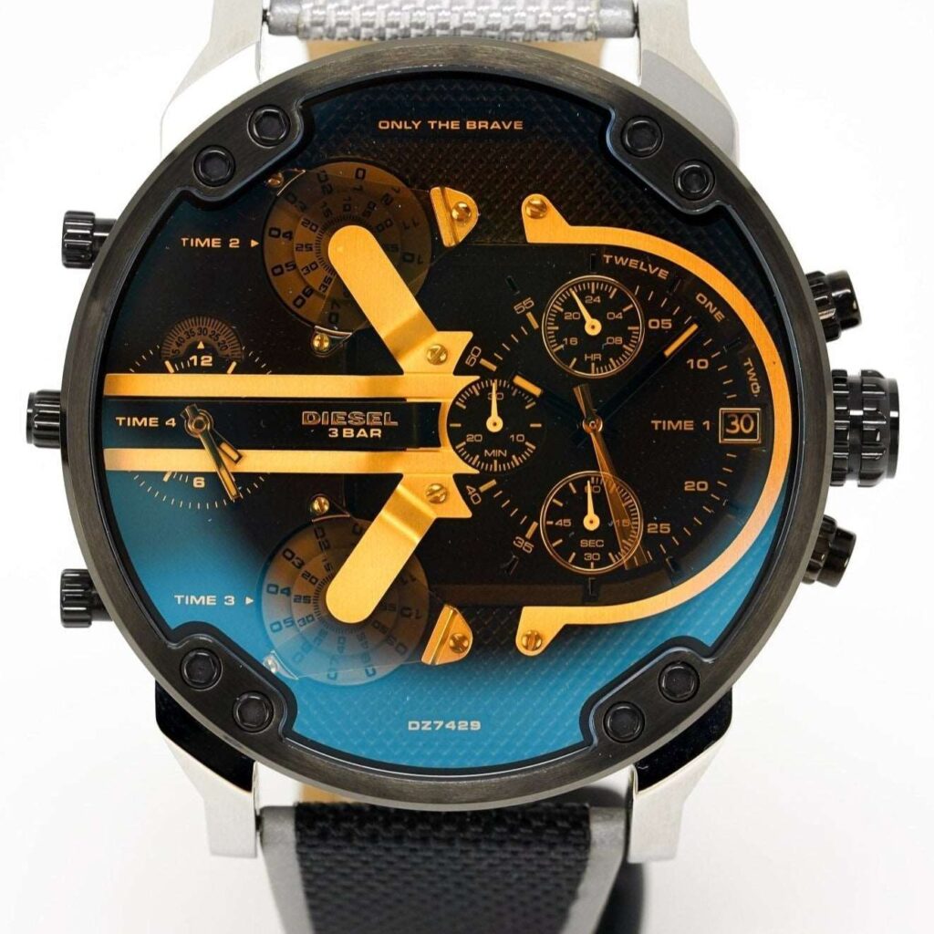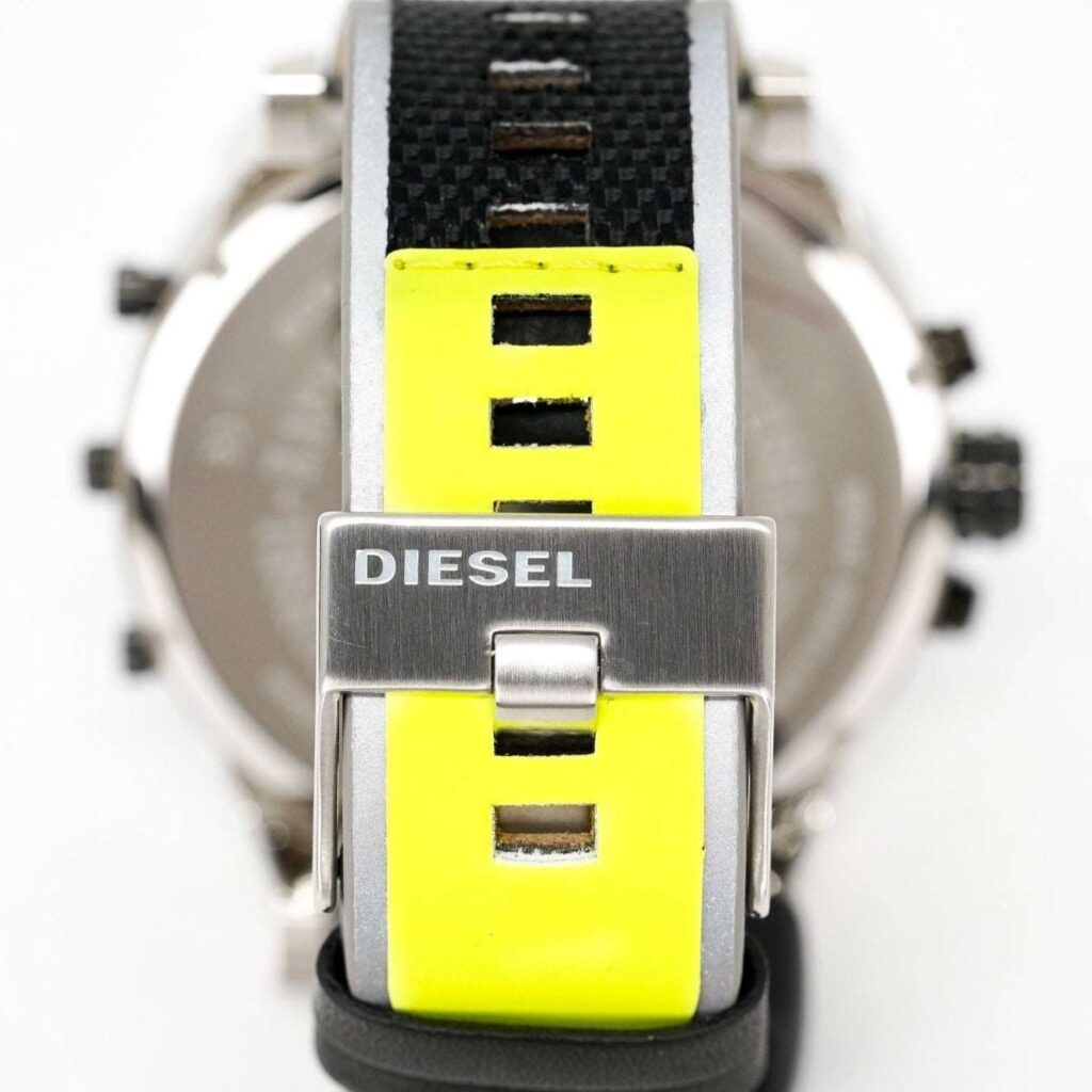 Diesel DZ7429 : Boîtier en acier inoxydable de 57 mm, cadran noir, double fuseau horaire, fonction chronographe, mouvement à quartz, étanche à 30 m. Un design audacieux et élégant pour toutes les occasions. Cette montre remarquable incarne le style unique et robuste de Diesel, un accessoire incontournable pour les tenues décontractées comme habillées.