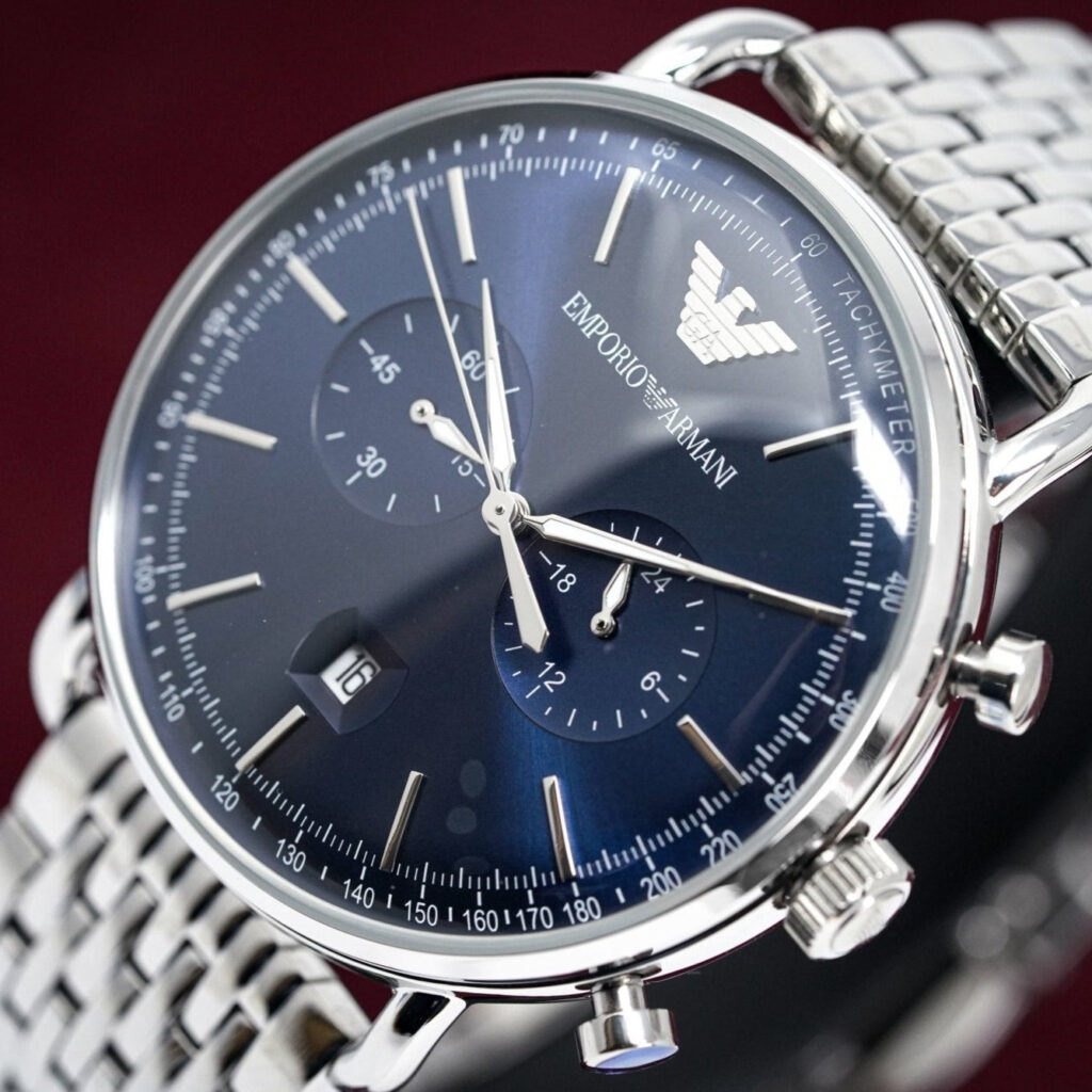 Blue Dial with Stainless Steel Hands and Indexes. Hour Counter at 3 O’Clock. 30 Minute Counter at 9 O’Clock. Date Window at 6 O’Clock