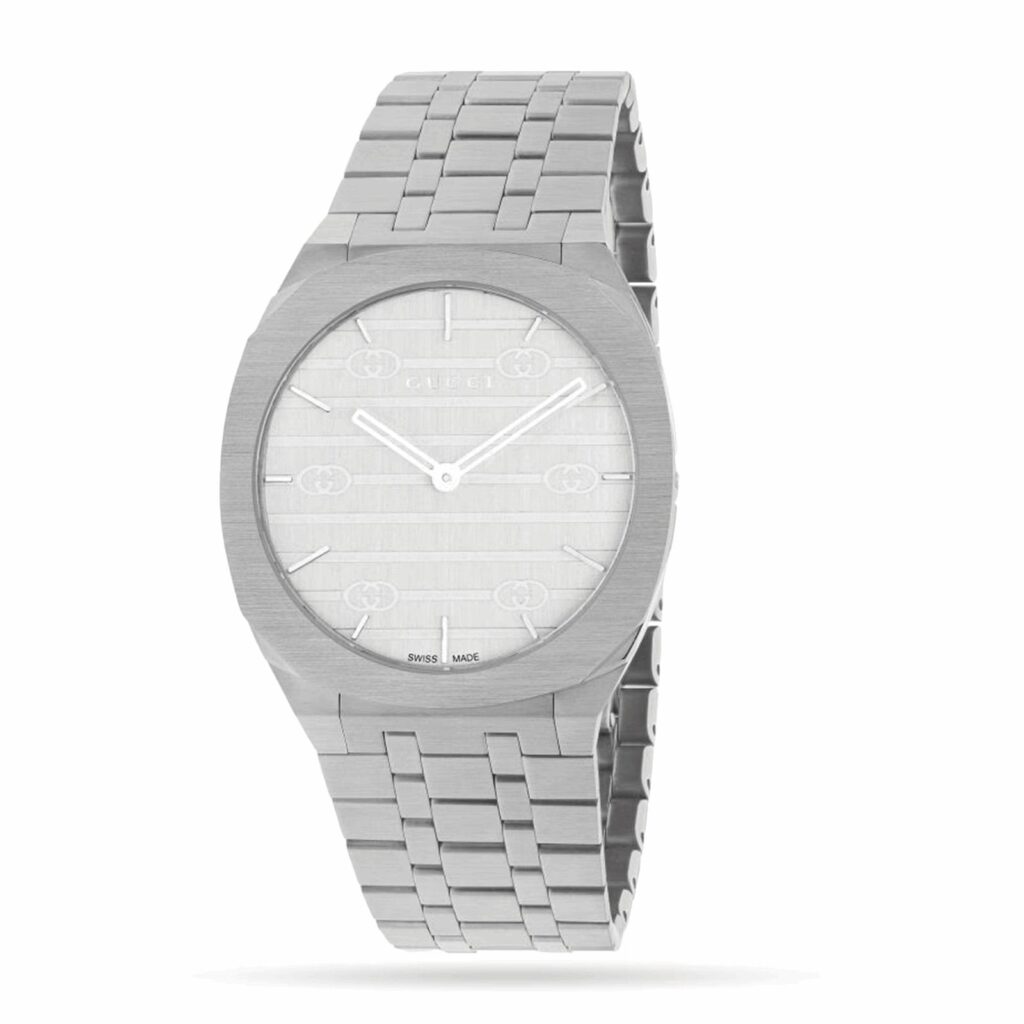 La silhouette épurée de la GUCCI 25H s'inspire des lignes élégantes de l'architecture contemporaine. La montre se distingue par son boîtier fin multicouche et son bracelet en acier à cinq maillons, le tout orné du monogramme de la Maison. Le nom, GUCCI 25H, est un talisman particulièrement symbolique pour le directeur artistique Alessandro Michele. Boîtier multicouche en acier inoxydable de 38 mm, cadran en laiton argenté orné du motif G entrelacé, bracelet en acier inoxydable à cinq maillons. Les certificats de garantie des montres Gucci achetées après le 1er mars 2022 sont disponibles exclusivement en ligne. Téléchargez le vôtre sur https://watchwarranty.gucci.com en utilisant le numéro de série gravé au dos de votre montre. 3 ATM (30 mètres/98 pieds). Verre saphir avec traitement antireflet. Mouvement à quartz. Tour de poignet de 120 mm à 195 mm. YA163407. Fabrication suisse.