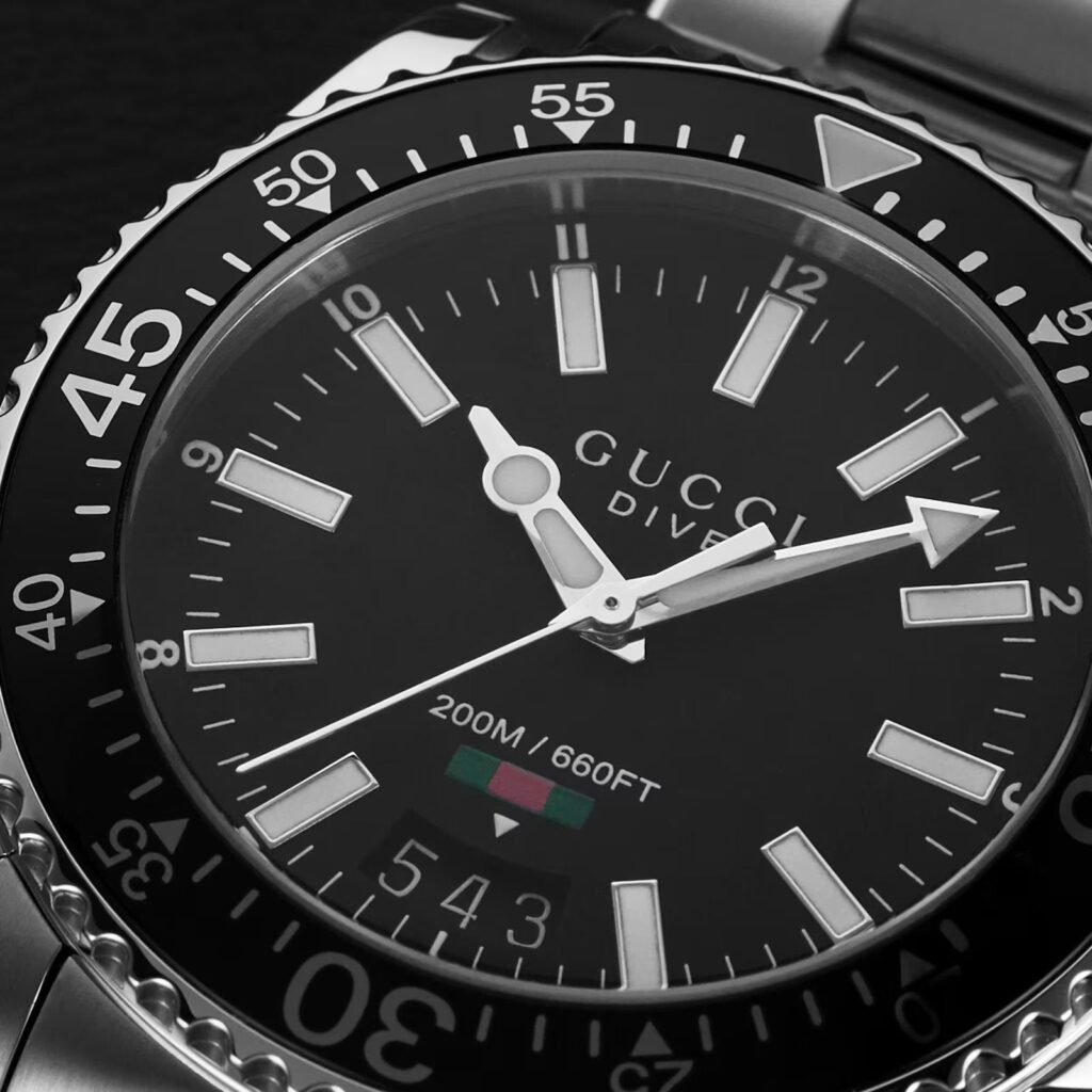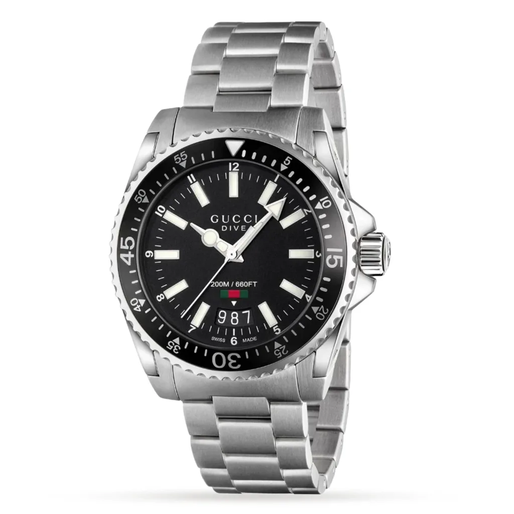 Cette montre Gucci pour homme, issue de la collection Dive et fabriquée avec un savoir-faire exceptionnel, présente un élégant boîtier en acier inoxydable de 40 mm orné d'index bâtons et d'un superbe cadran noir, le tout protégé par un verre saphir.