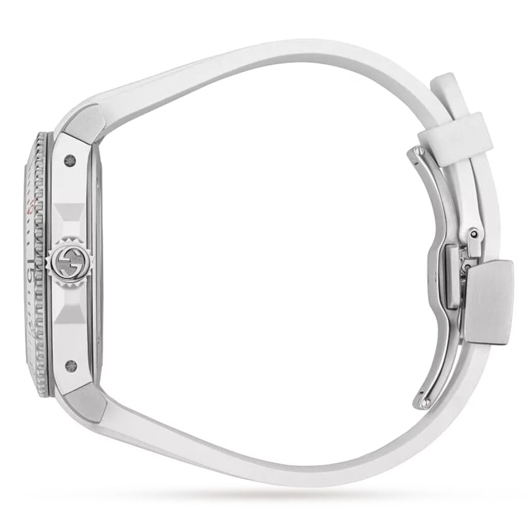 Avec sa silhouette inspirée des détails caractéristiques d'une montre de plongée, la Gucci Dive séduit par son allure contemporaine, son cadran argenté et son bracelet en caoutchouc blanc. Boîtier en acier, lunette blanche, côtés et couronne en caoutchouc blanc, cadran argenté à index multi-icônes, bracelet en caoutchouc blanc. Verre saphir avec traitement antireflet. Les certificats de garantie pour les montres Gucci achetées après le 1er mars 2022 sont disponibles exclusivement en ligne. Téléchargez le vôtre sur https://watchwarranty.gucci.com en utilisant le numéro de série gravé au dos de votre montre. 20 ATM (660 pieds/200 mètres). Mouvement à quartz. Tour de poignet : 150 mm à 195 mm. YA136337. Fabrication suisse.