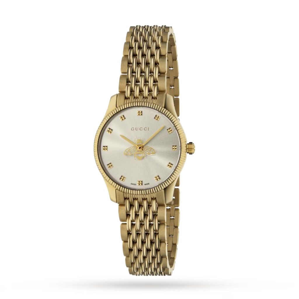 - Cadran argenté guilloché – Orné de **marqueurs à motif d’abeille emblématique de Gucci** pour une touche de luxe distinctive.