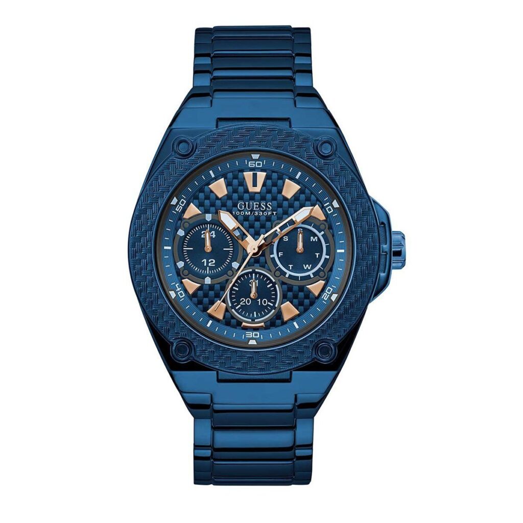 Cadran texturé en fibre de carbone bleue avec aiguilles et index en acier inoxydable PVD or rose.