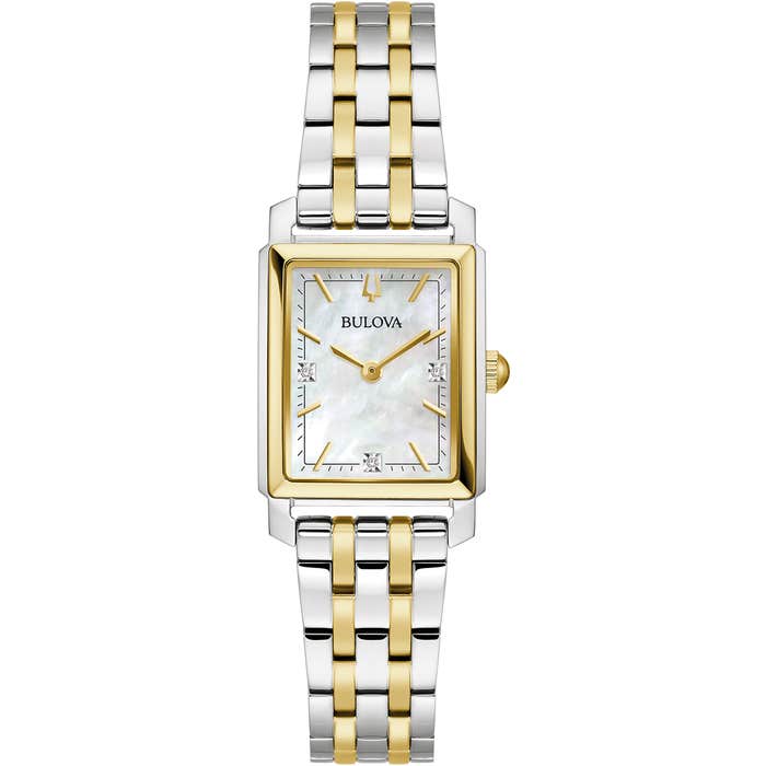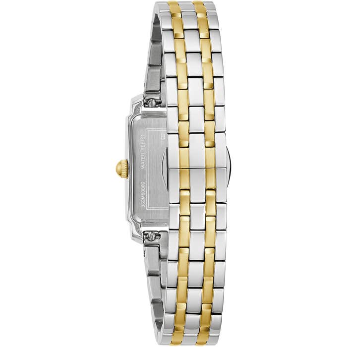 Cette montre Bulova pour femme apporte une touche de modernité à la collection Sutton, déjà très raffinée. Son élégant boîtier rectangulaire bicolore en acier inoxydable s'accorde parfaitement avec son bracelet. Le cadran en nacre brillante est rehaussé d'index et d'aiguilles dorés, dont trois sertis de diamants, pour une allure d'une sophistication absolue. Cette montre Bulova est idéale pour la femme qui affirme son style.