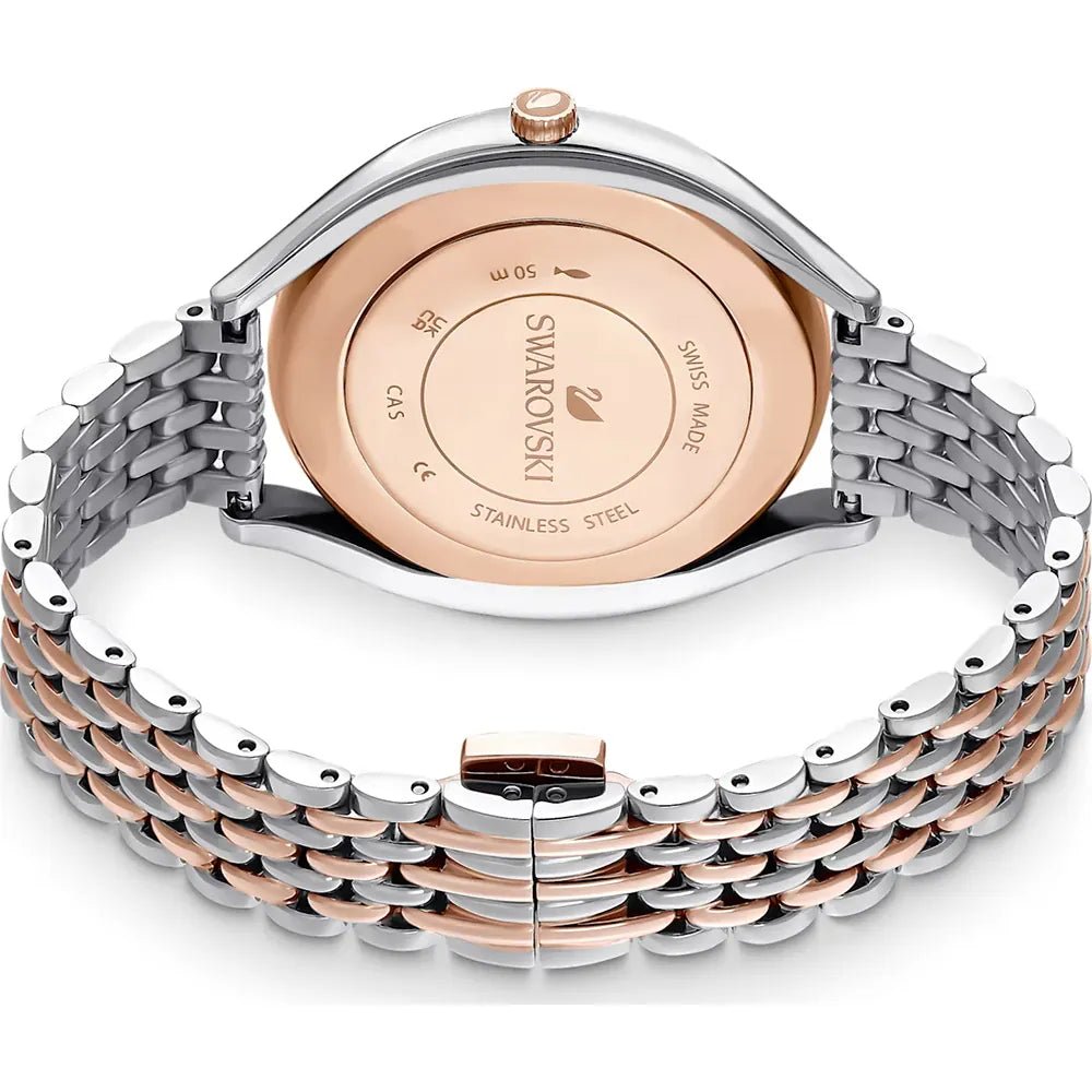 Elevate your style with the exquisite Swarovski Crystalline Aura Quartz Two-Tone Rose Gold-Tone Watch, a stunning timepiece designed for the modern woman who values both elegance and precision. Crafted in Switzerland, this watch combines Swarovski’s signature crystal craftsmanship with practical functionality. The 35.5mm case is adorned with over 1,300 meticulously placed crystals, creating a dazzling effect that catches the light with every movement. The Swarovski swan at the 12 o’clock position adds a graceful touch, symbolizing the brand’s commitment to luxury and design excellence.