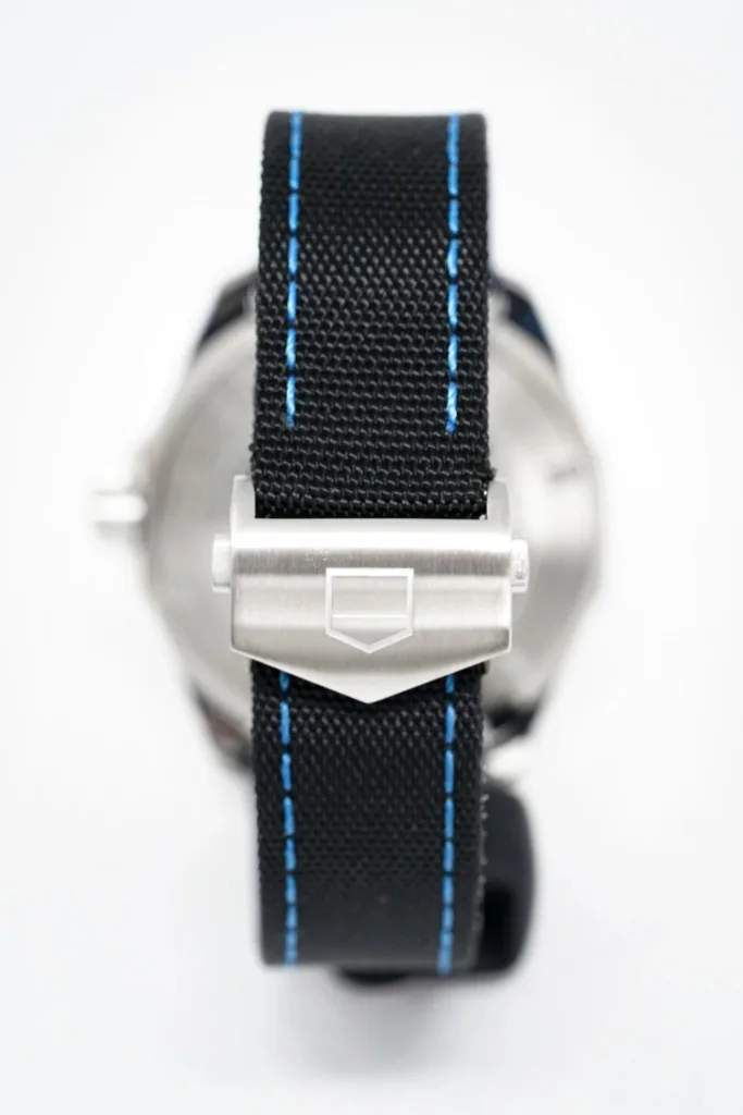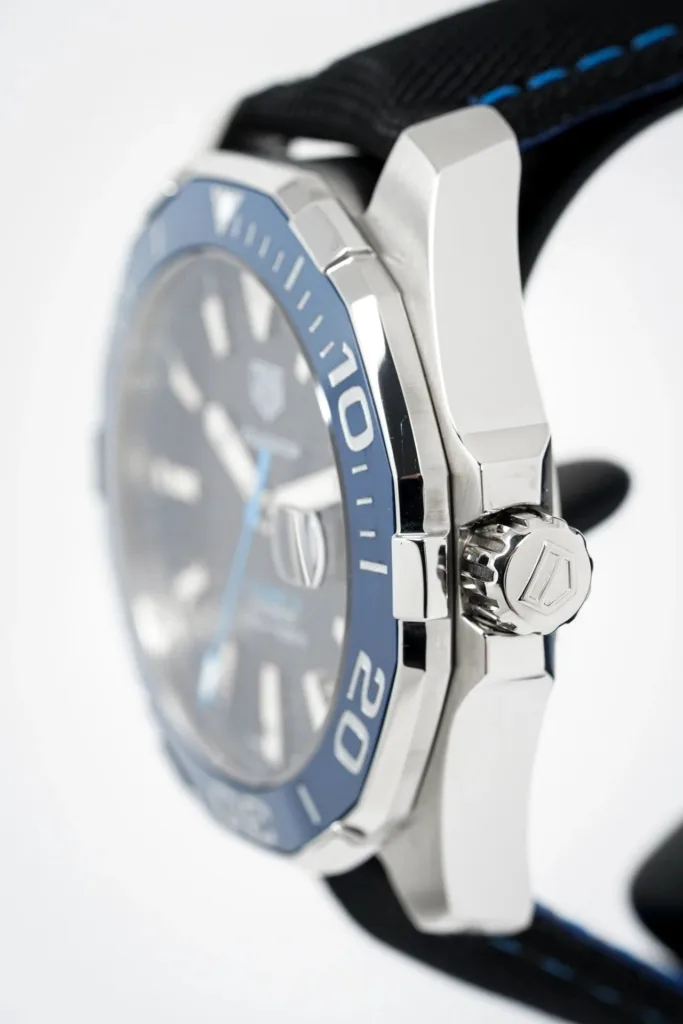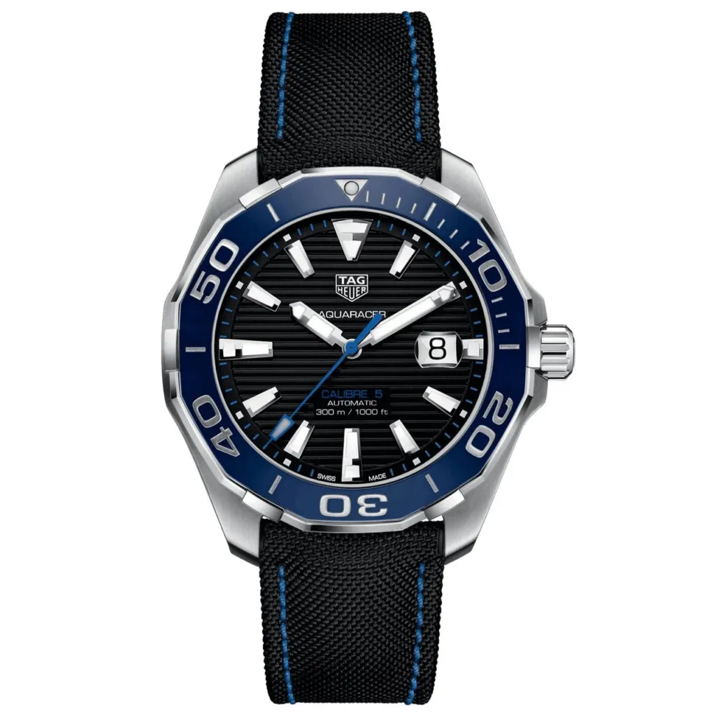 La TAG Heuer Aquaracer Calibre 5 43 mm (Réf. WAY201C.FC6395) est une montre robuste et raffinée, conçue pour l'homme urbain et aventureux. Dotée d'un boîtier en acier inoxydable de 43 mm, d'une lunette en céramique bleue graduée sur 60 minutes et d'un cadran noir avec aiguilles et index luminescents, elle allie performance sportive et polyvalence au quotidien. Son mouvement automatique TAG Heuer Calibre 5 offre une réserve de marche d'environ 38 heures et bénéficie de la fiabilité suisse éprouvée. Étanche à 300 mètres, avec sa couronne et son fond vissés, et son bracelet en textile noir confortable, cette Aquaracer est prête à vous accompagner partout. Un choix idéal pour ceux qui exigent style et performance de leur montre.