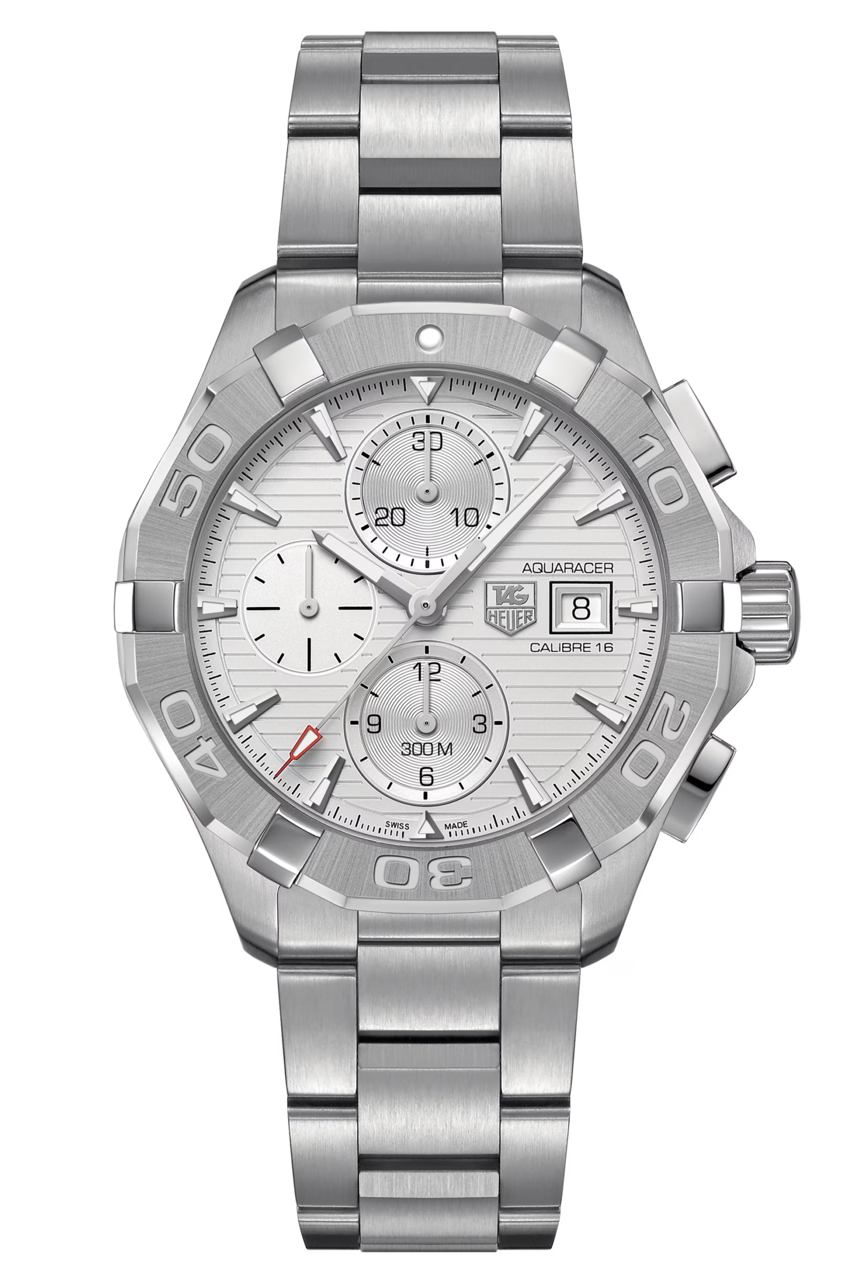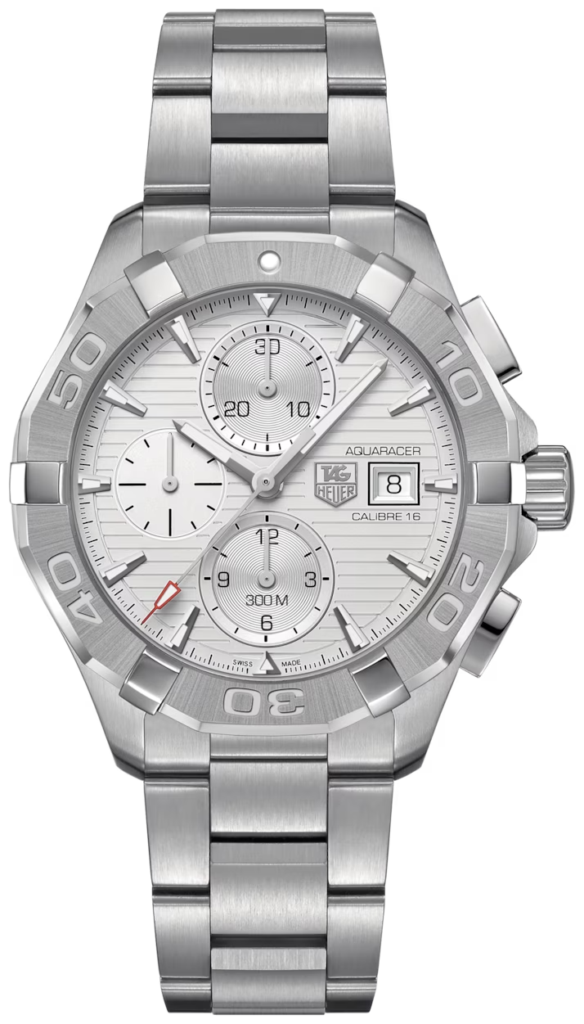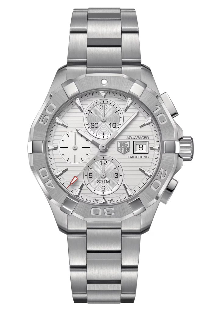 TAG HEUER Aquaracer Calibre 16 Gents Watch has a Stainless steel case with Silver steel bracelet Unidirectional turning bezel and Fine-brushed and polished steel. White dial with Rhodium plated luminescent indexes.