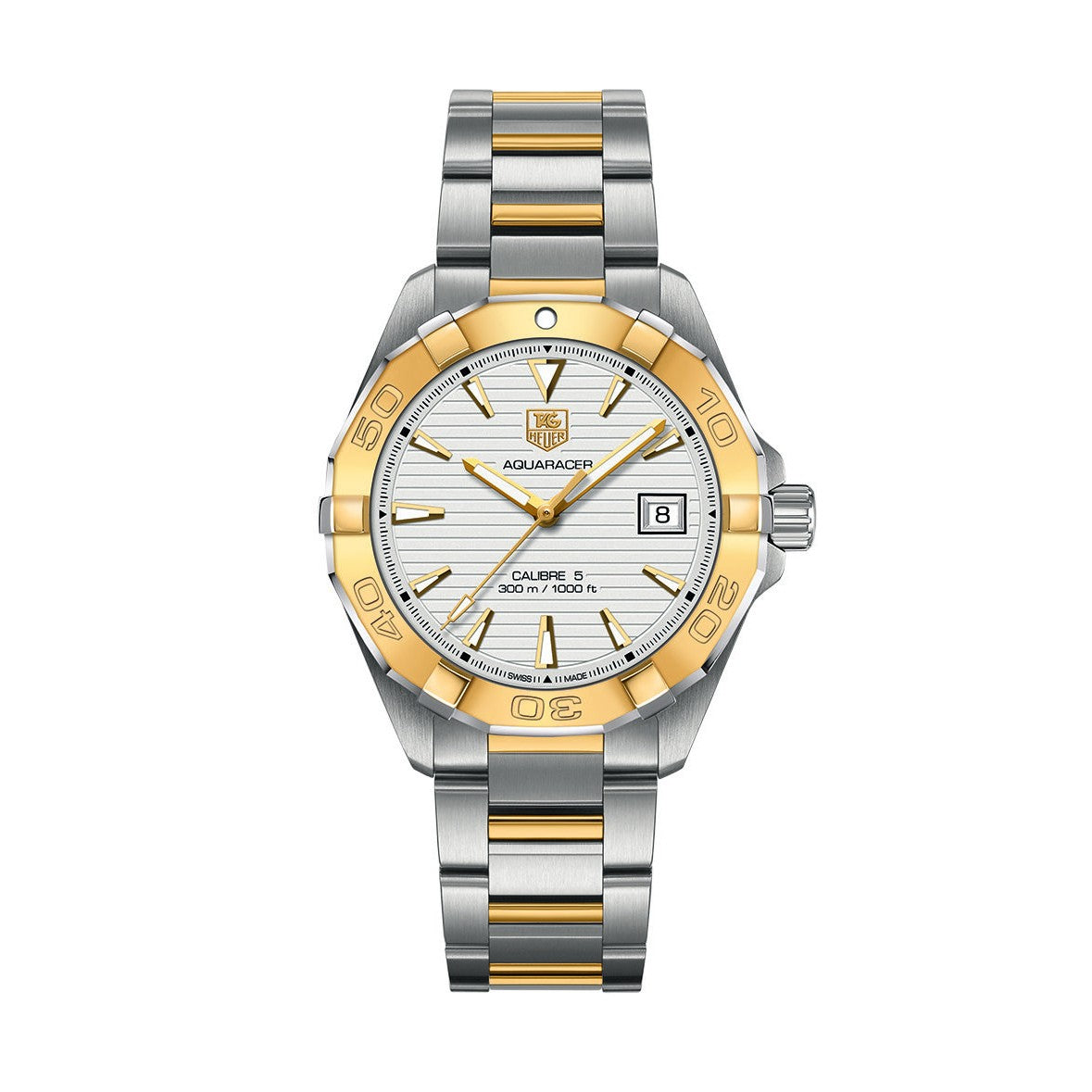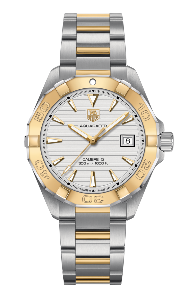 Swiss-made, this bold TAG Heuer Aquaracer is an aesthetic 41 mm watch. This model features a Steel and Gold case and a Calibre 5 Automatic movement.