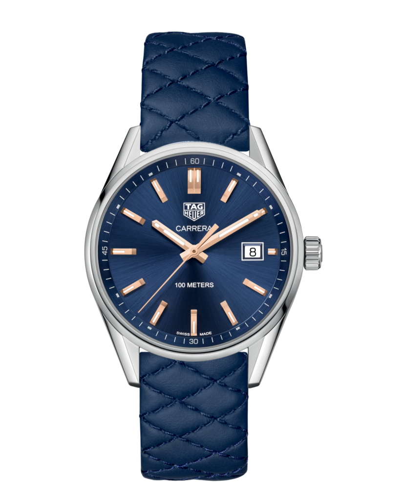 A beautiful blue dial with rose-gold details and an on-trend strap of quilted calfskin. The case in polished steel, makes a statement of decisive poise and assured confidence.Â