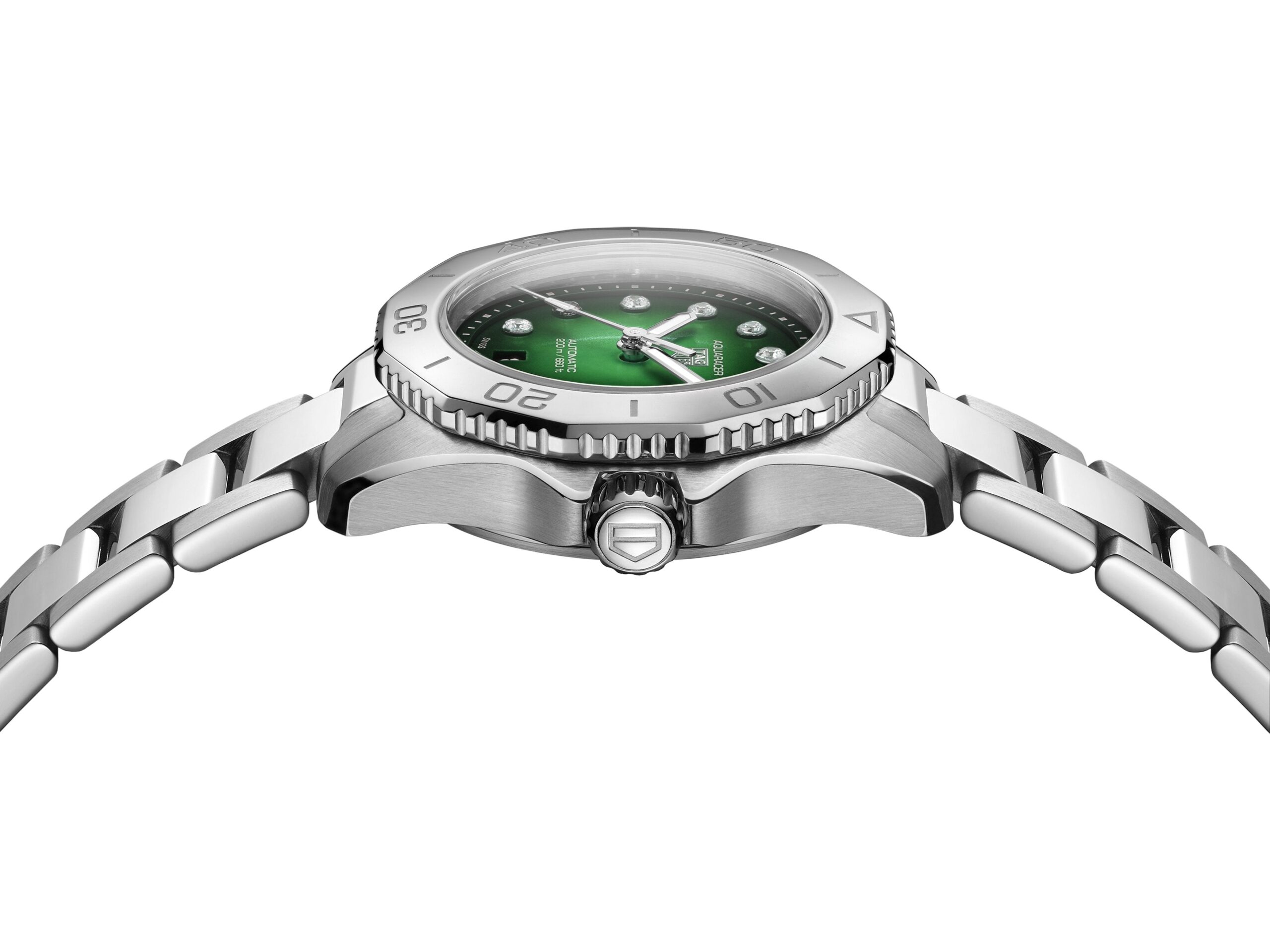 Introducing the elegant TAG Heuer Aquaracer Professional 200 WBP2415.BA0622, a perfect blend of luxury and performance for modern women. This striking timepiece features a vibrant emerald green dial adorned with 11 brilliant diamond hour markers, adding a sophisticated touch to its sporty design. Encased in a 36mm stainless steel case, it is both durable and comfortable for daily wear. The unidirectional rotating bezel ensures functionality for diving, while the Swiss-made automatic movement offers reliability. Water-resistant to 200 meters, this watch is ideal for those who value a chic style that can handle the adventures of everyday life. With its classic stainless steel bracelet and refined aesthetics, this TAG Heuer Aquaracer is designed for women who desire an active yet refined timepiece.