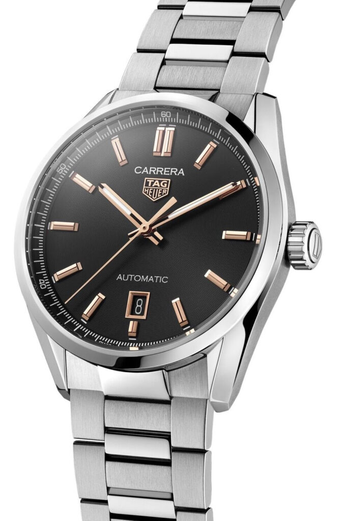 Renowned for their highly accurate and powerful movements, TAG Heuer have equipped this TAG Heuer Carrera watch with one of their famous Swiss made self-winding calibres. The Calibre 5 automatic movement brings to life the hour, minute and seconds function and a date window at 6 o’clock on a handsome black dial. The functions are displayed using sleek rose gold plated hands with white Superluminova inserts and matching rose gold applied indexes. Protecting the dial is a layer of sapphire crystal glass famed for its scratch resistance and crisp legibility equipped to a 39mm stainless steel case with an exhibition case back. For one final touch of sophistication, this TAG Heuer Carrera watch for men is fitted with a H-shaped three-row link stainless steel bracelet and a folding clasp with push buttons.