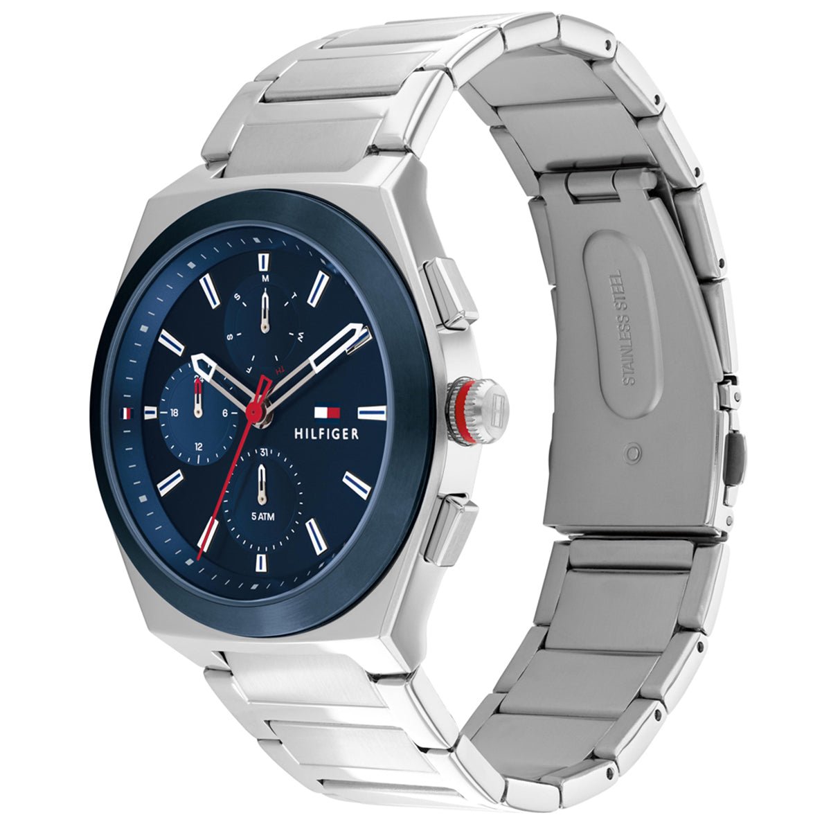 Cette montre Tommy Hilfiger possède un boîtier en acier inoxydable de 44 mm de diamètre et un bracelet en métal. Elle abrite un mouvement et est dotée d'un verre minéral.