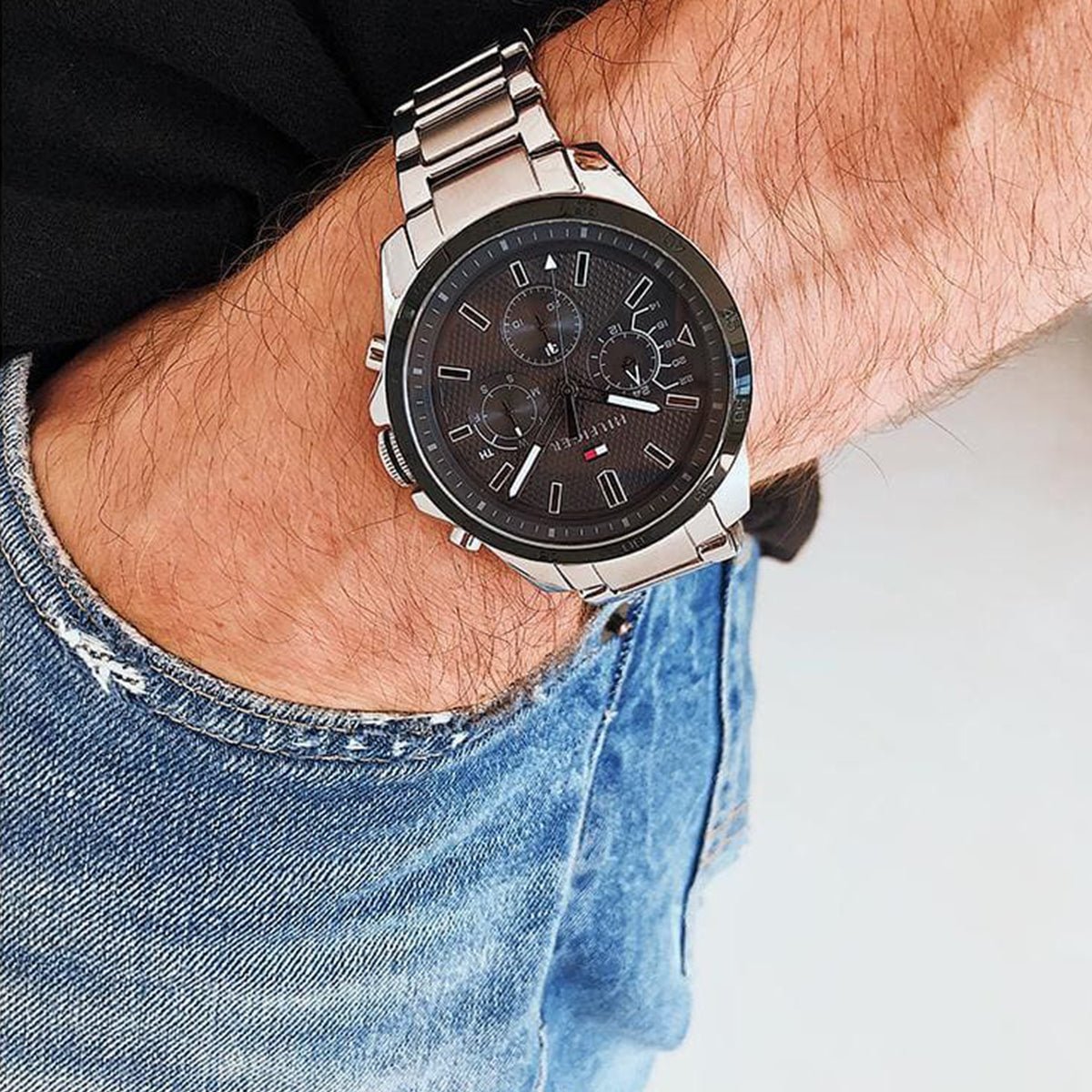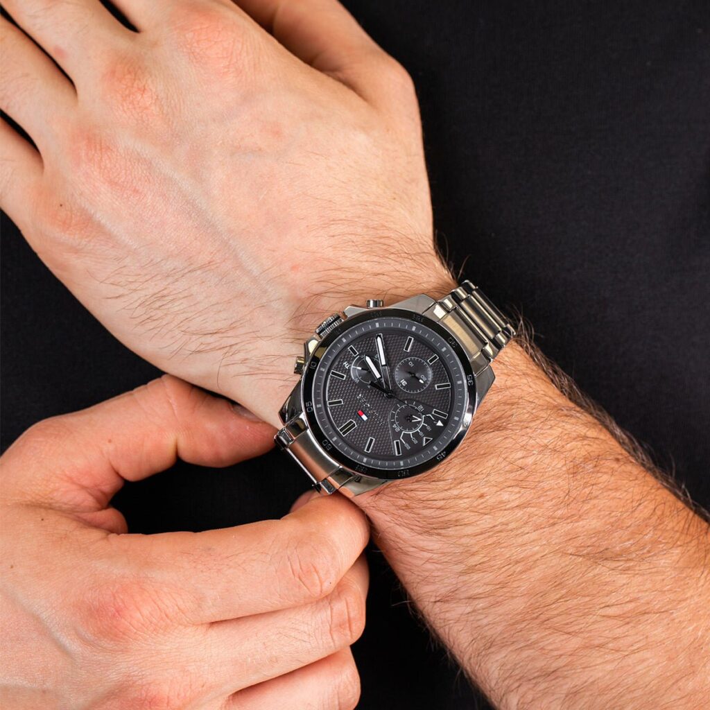 Brand Tommy Hilfiger Type Stainless Steel Watch Model Number 179.1564 Band Color Silver and Gold Targeted Group Men Dial Case Size 48 millimeters 50 Meter Water Resistant Analog Display 3 hands hour minute second Mineral glass Date and day display