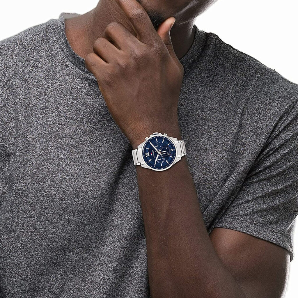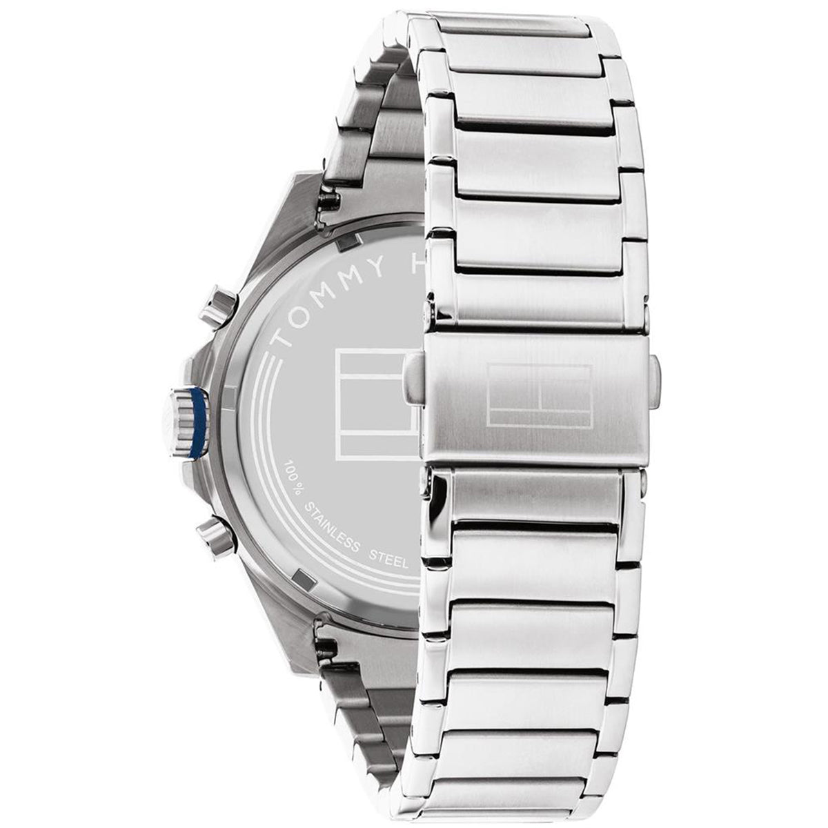Distinctive Sport. Make every moment count with this brushed sunray dial time piece with bold accents and pops of Tommy color. Integrated link bracelets and silicone straps. 44MM Multifunction: 24-Hour (9H), date (6H), and weekday sub-eyes (3H)