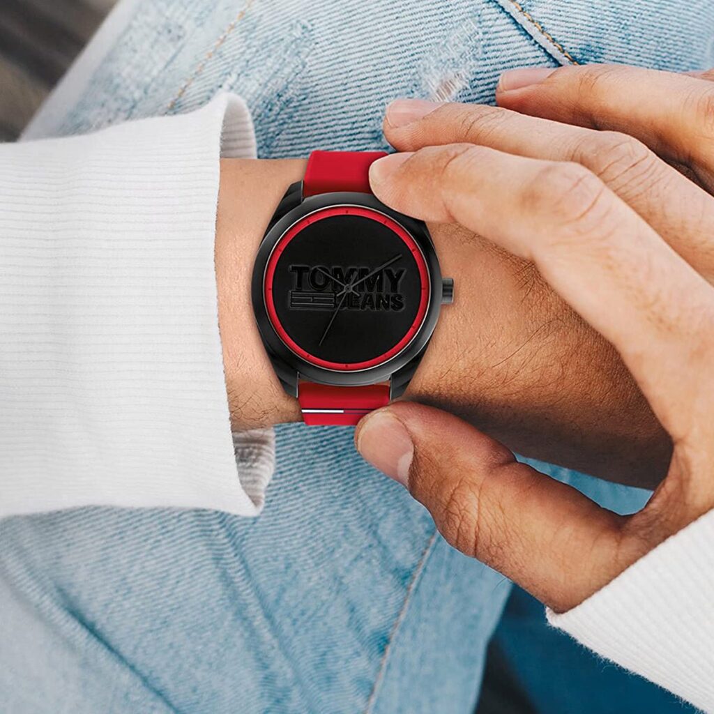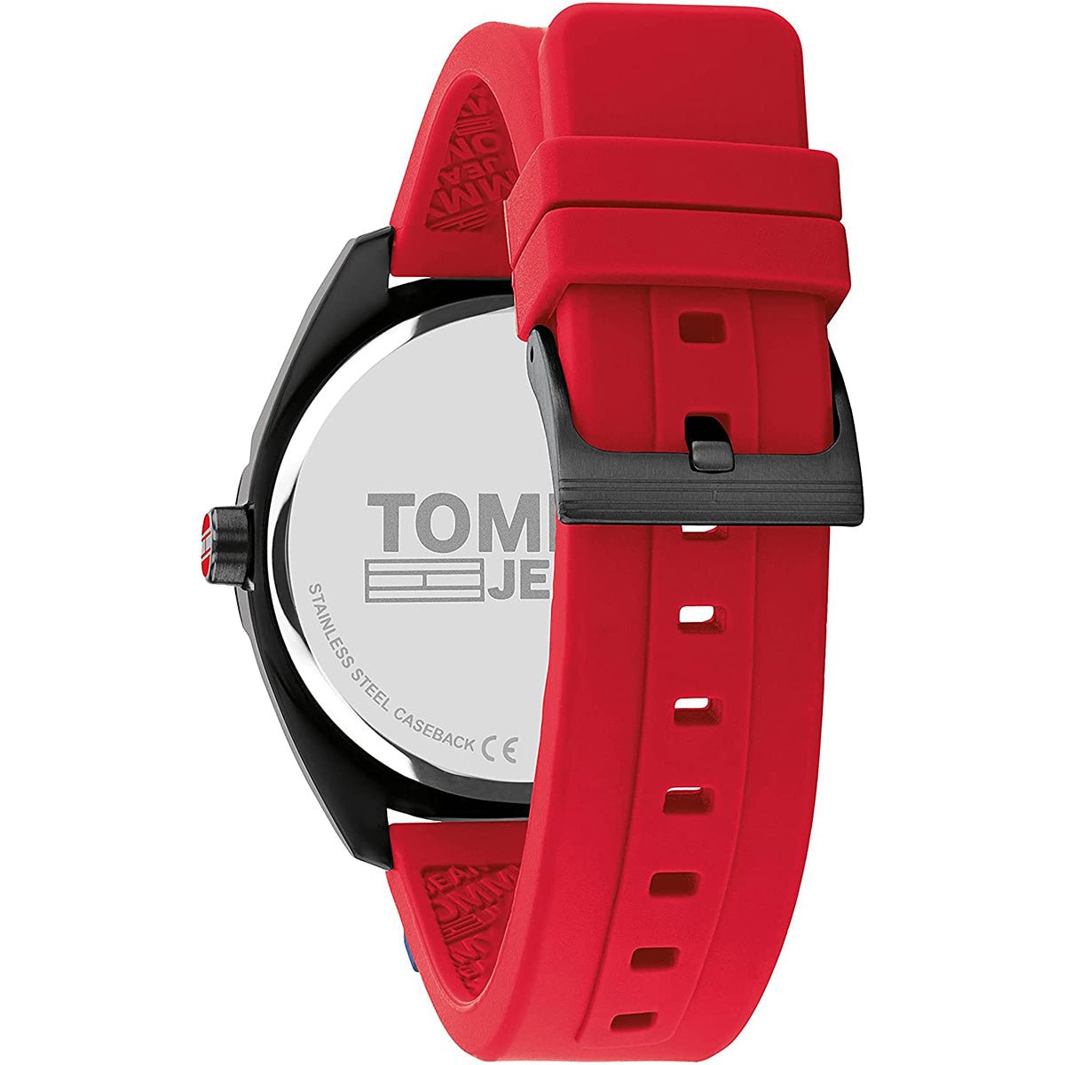 Cette montre fait partie de la collection San Diego de Tommy Hilfiger. Ce modèle présente un cadran noir orné du logo de la marque en son centre. Les aiguilles sont noires. Le boîtier est en plastique noir. Il mesure 44 mm de diamètre et 10,4 mm d'épaisseur. Cette montre est dotée d' un bracelet en caoutchouc résistant. Ce modèle est résistant aux éclaboussures et ne doit pas être immergé dans l'eau.