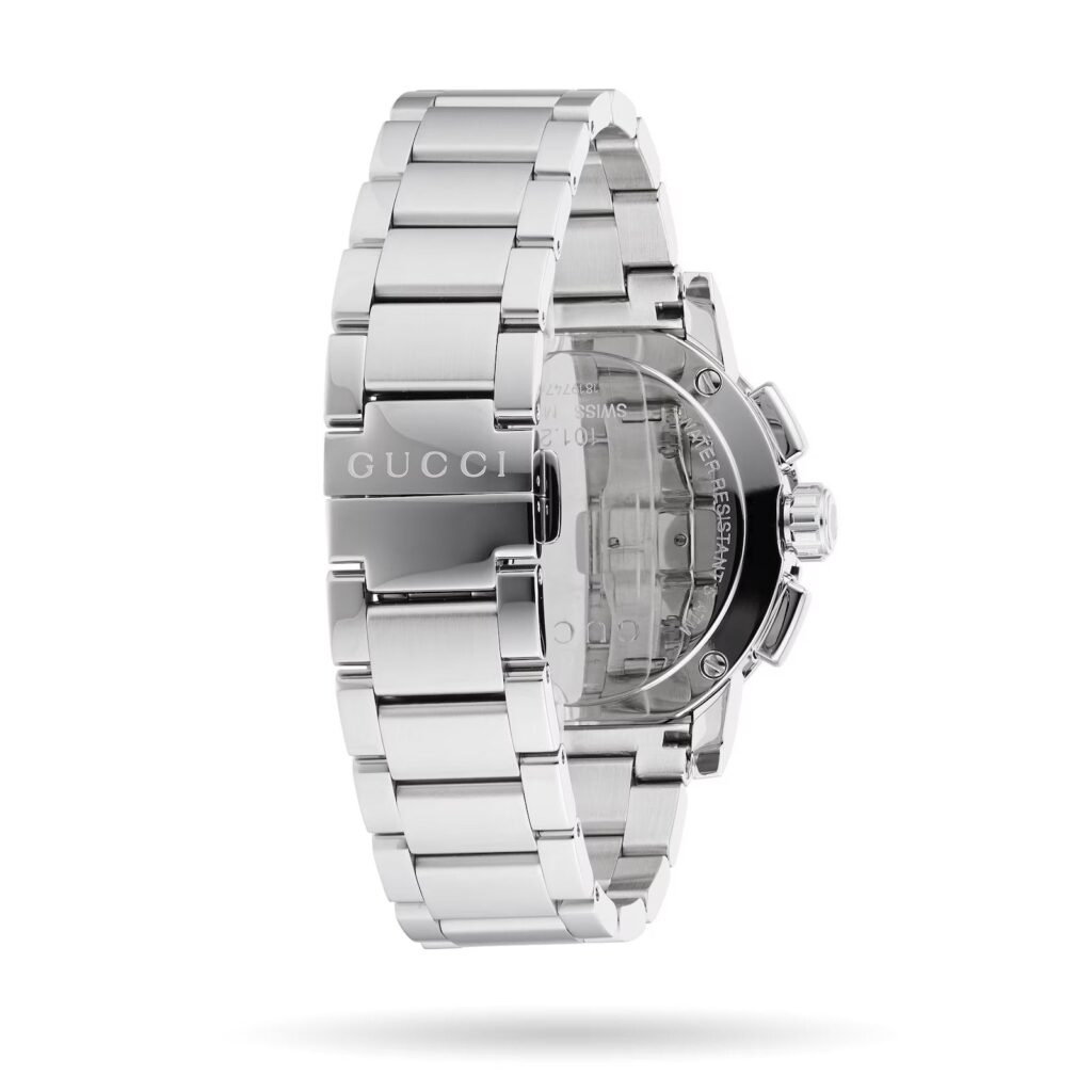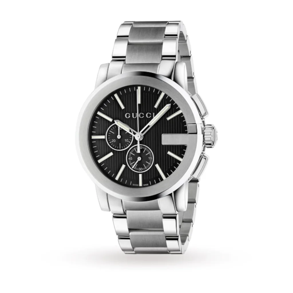 The G-Chrono watch is defined by the iconic G-shaped bezel, paying homage to the House. The contemporary design lends a modern, sporty look. Steel case with black guilloché dial, steel bracelet. The warranty certificates for Gucci watches purchased after March 1st 2022 are exclusively available online. Download your certificate at https://watchwarranty.gucci.com by using the serial number engraved on the back of your watch. Quartz movement Water resistance: 5 ATM (160 feet/50 metres). Wrist size adjustable from 141mm to 216mm YA101204. Swiss Made.