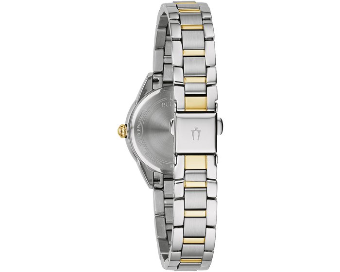 From the Classic Collection. This Ladies’ timepiece is the perfect addition to any watch collection, with a two-tone stainless steel case and bracelet with a silver white dial featuring gold-tone hands and markers for a timeless look. Also including domed mineral crystal and a short fold over buckle closure.