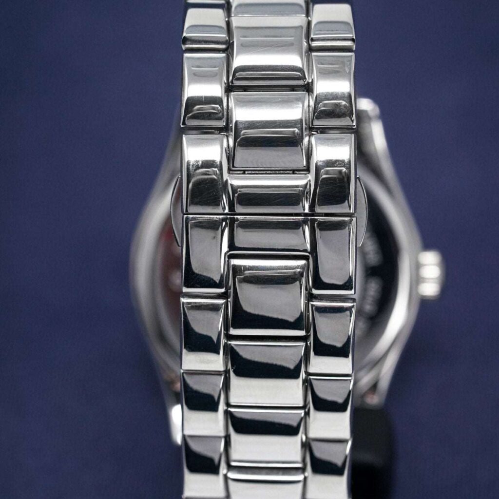 The polished stainless steel case and matching bracelet add a luxurious touch to this elegant timepiece, making it a versatile choice that can be effortlessly worn on any occasion, whether it is formal or casual. The iconic Emporio Armani eagle logo sits proudly at the 12 o’clock position, symbolizing quality and a commitment to exceptional craftsmanship.
