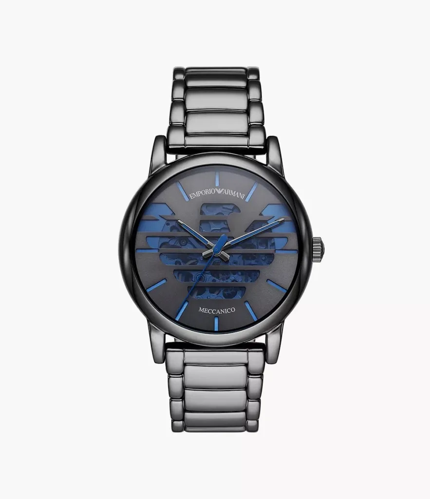 Step into the world of luxury and mechanical elegance with the Emporio Armani AR60029 Men’s Meccanico Watch. This sophisticated timepiece is designed for the modern man who appreciates both style and precision. Featuring a captivating grey dial with blue skeleton accents that reveal the intricate inner workings, a polished gunmetal stainless steel case, and a matching gunmetal stainless steel bracelet, the AR60029 is perfect for any occasion, from formal events to casual outings.