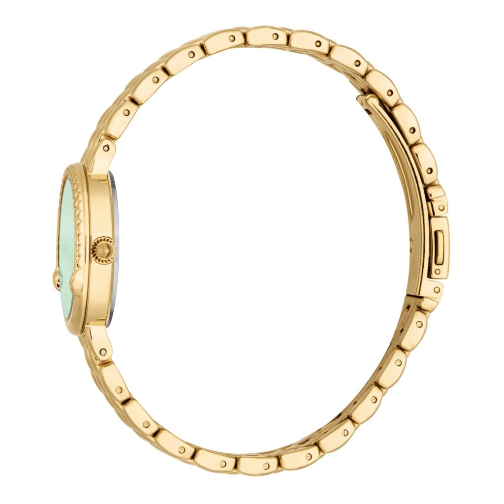 Reveal an alluring blend of sleek sophistication and bold charm with this luminous yellow gold timepiece, complemented by a vibrant bottle green dial adorned with sparkling zircon stones. Its smooth, polished finish and dynamic movement evoke a sensual lightness and subtle motion, perfect for capturing admiring glances. Designed for confident women embracing every moment, it promises to elevate your style and define your distinctive lifestyle.