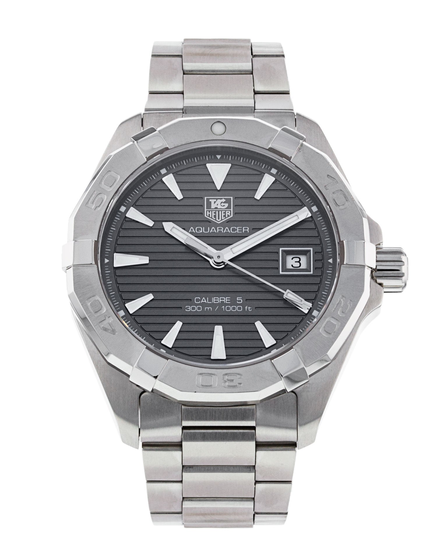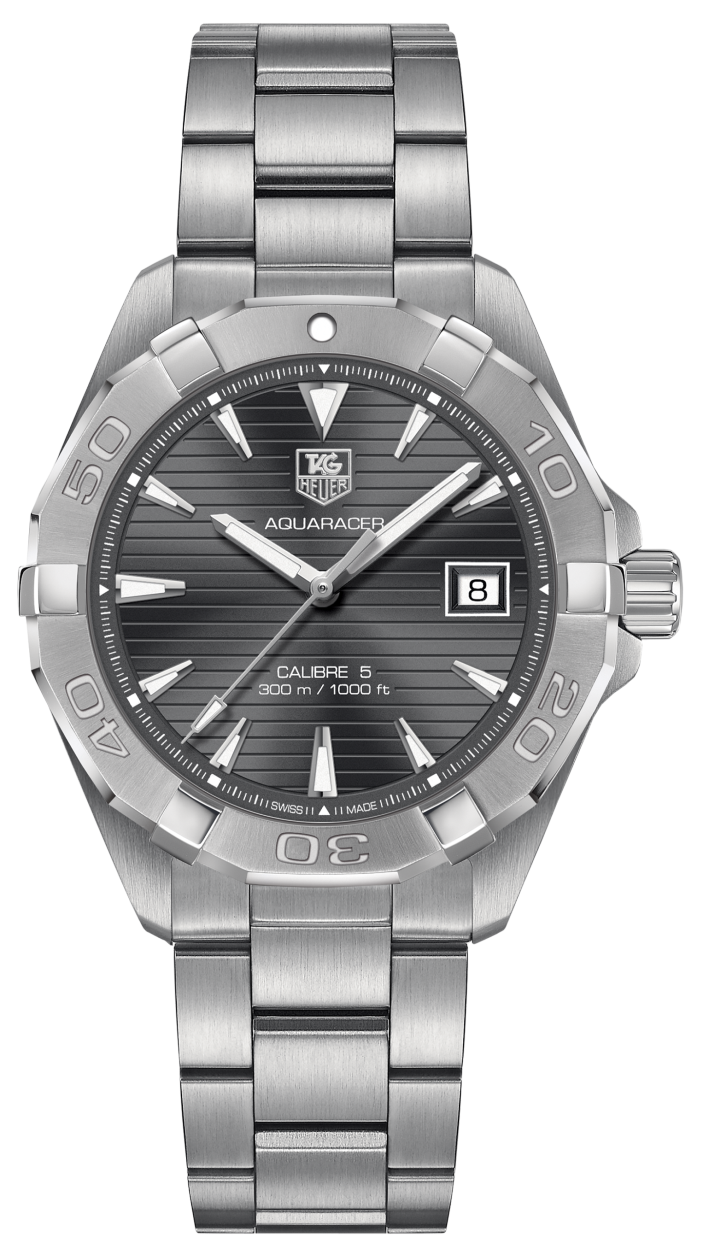 Brand New Authentic Tag Heuer Aquaracer 300M Automatic Anthracite Dial Steel Men’s Watch Model WAY2113.BA0928. Brushed and Polished Stainless Steel case with Brushed Stainless Steel watch band. Uni-Directional Rotating, Engraved with 60 Minute Scale bezel. Dial description: Grey Linear Design with Date at 3 dial. Grey dial. Automatic Self Winding Calibre 5 with 38 to 46 Hour Power Reserve movement. Screw Down crown. Scratch Resistant Sapphire crystal. Case size: 41mm. Solid case back. 300 Meters / 1000 Feet water resistant. 2 year warranty. Also known as model: WAY2113-BA0928, WAY2113BA0928.