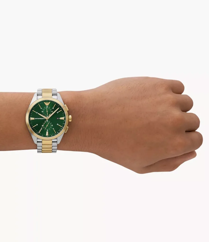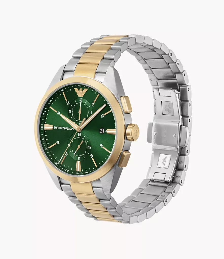 Enhance your style with the Emporio Armani AR11511 Men’s Chronograph Watch. This sophisticated timepiece is designed for the modern man who values both luxury and functionality. Featuring a striking green dial, a two-tone stainless steel and gold-tone bracelet, and a tachymeter bezel, the AR11511 is perfect for any occasion, from formal events to casual outings.