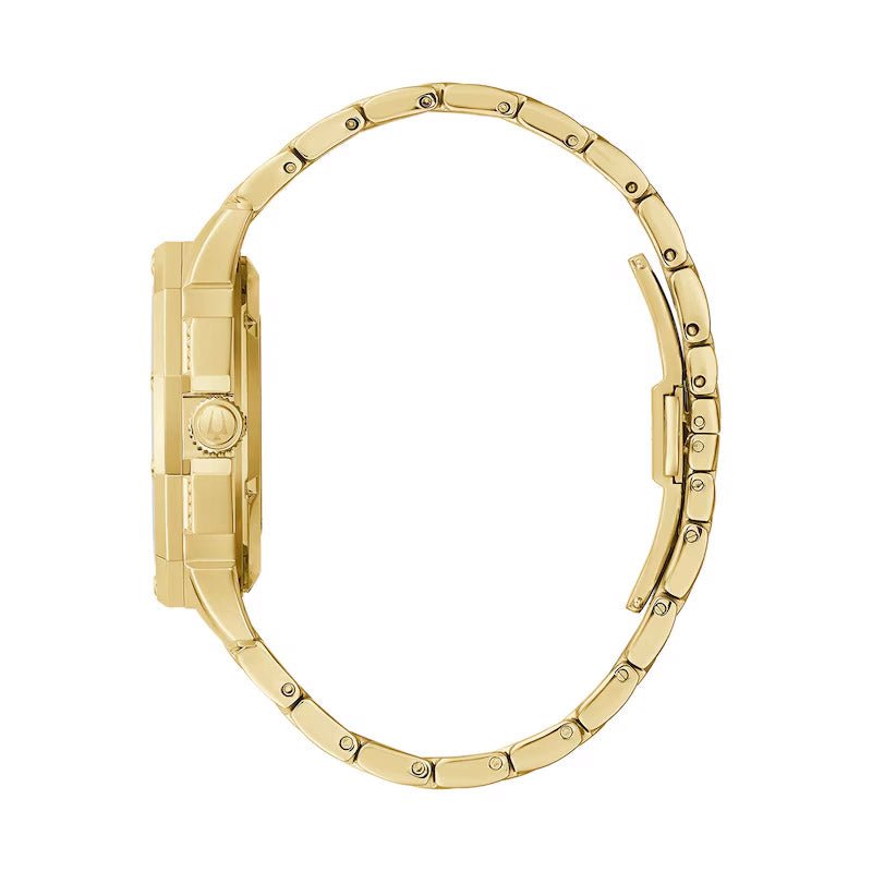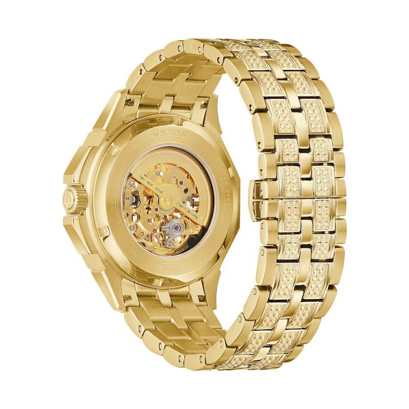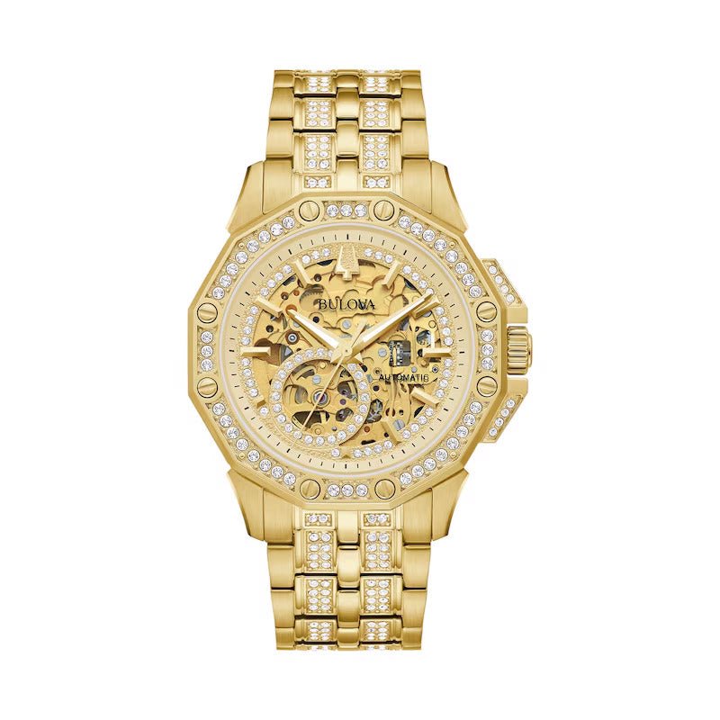 Make a statement with this men’s automatic Bulova Crystal Octava timepiece. Featuring a gold-tone plated stainless steel case embellished with crystals on the bezel, bracelet, and dial. The automatic movement is visible from the front and back. Finished with a gold-tone bracelet and a double push button folding clasp, this watch combines luxury and functionality.