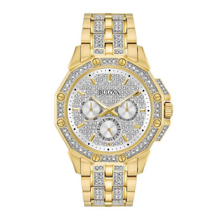 Make a statement with a Bulova Crystal timepiece. Featured in a gold-tone stainless steel case embellished with crystals on the bezel, bracelet and pave dial. Additional features include a multi-function movement, gold-tone stainless bracelet with deployment closure, and water resistant to 30 metres.