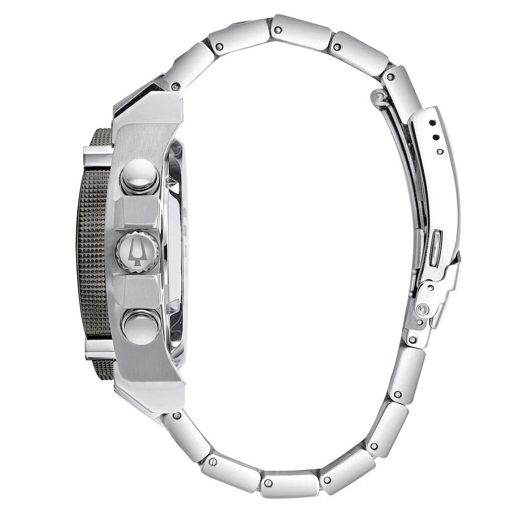 This Men’s timepiece harnesses the power of Bulova’s proprietary eight-hand quartz chronograph movement, renowned for its exceptional accuracy with a 262kHz vibrational frequency—eight times higher than standard timepieces. Encased in stainless steel and grey ion-plated with a screw-back case and screw-down crown, it boasts a striking black carbon fibre chronograph dial with a convenient date feature. Additional features include a curved mineral crystal for enhanced durability, a stainless steel bracelet with a secure fold-over buckle closure, safety bar, and extender. With water resistance up to 300 meters, this watch combines precision, style, and robust functionality for versatile use in any setting.
