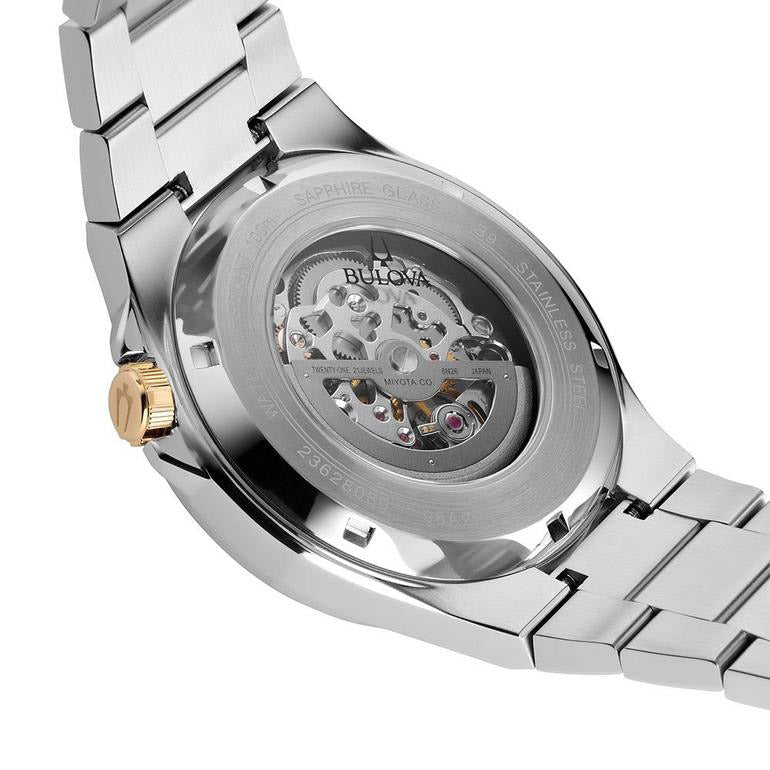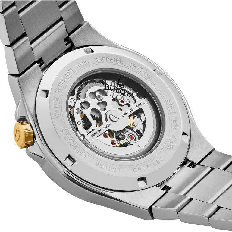From the Classic Collection, this timepiece showcases timeless elegance. Housed in a stainless steel case with a gold-tone crown, the watch features an open aperture black dial adorned with gold-tone accents, luminous hands, and markers for enhanced visibility in any light. Powered by automatic movement and protected by scratch-resistant sapphire glass, it includes a stainless steel bracelet and offers water resistance up to 100 meters.