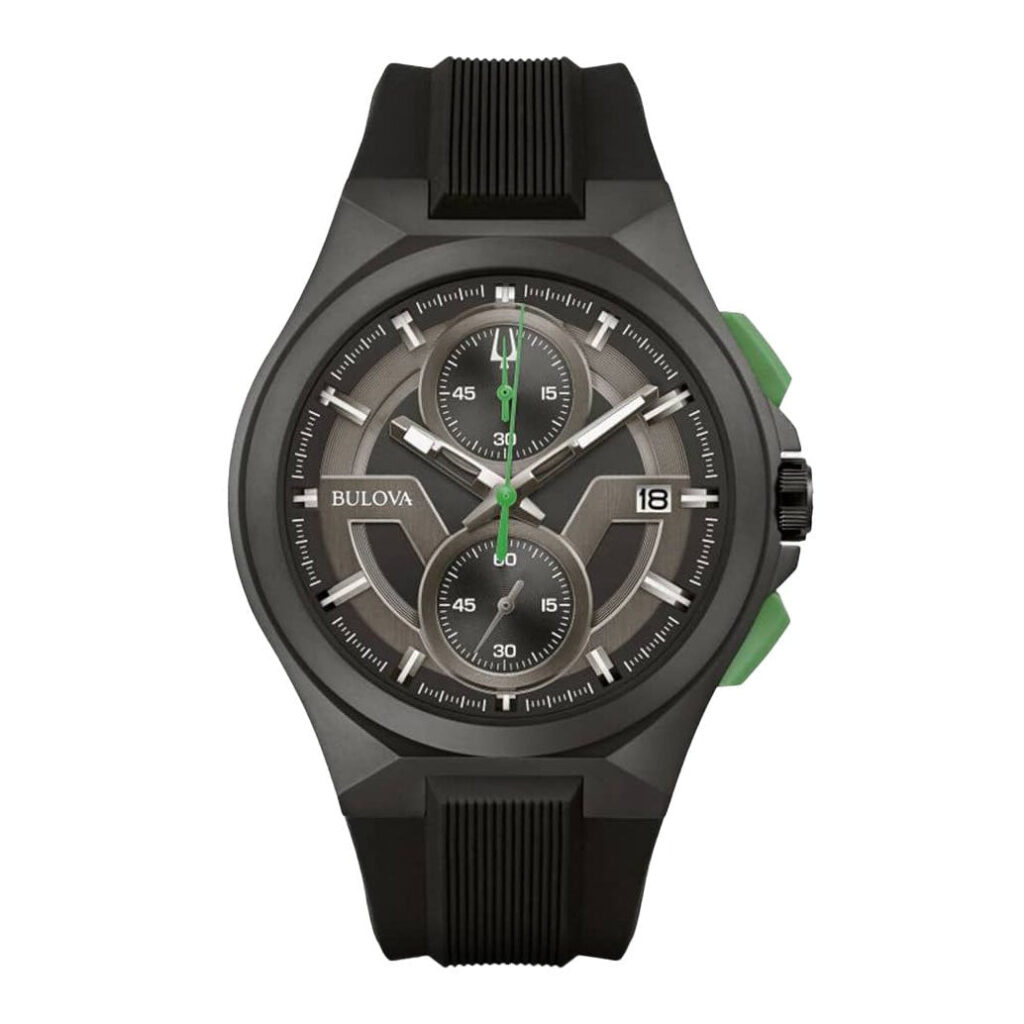 Discover modern wrist styling with the Maquina, featuring a comfortable black silicone strap and a sleek black IP stainless steel case. The black dial is complemented by vibrant green accents and includes a practical date display at the 3 o’clock position. Additional features encompass a 1/20 chronograph capable of measuring up to 60 minutes, 100-meter water resistance, and a scratch-resistant sapphire crystal.