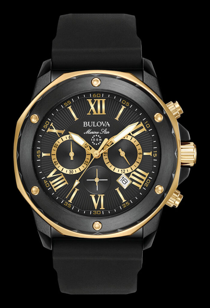 This men’s chronograph watch from the Marine Star collection by Bulova features a black dial, yellow-gold-tone accents, three timing subdials and a date window set in a black ion-plated stainless steel case. A mineral crystal tops the case, while a buckle secures the black silicone strap. The men’s watch has a quartz chronograph movement, and is water-resistant to 100 meters.