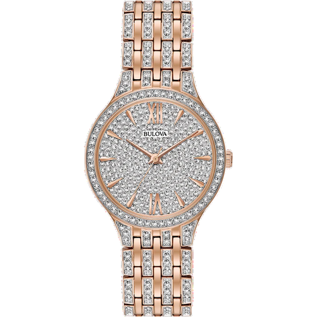 From the Ladies Crystals Collection. New slim dress styling in rose gold-tone stainless steel embellished with 440 Swarovski Crystals on bracelet, bezel and full-pav dial, deployant closure, and water resistance to 30 meters. Case size 32 mm.