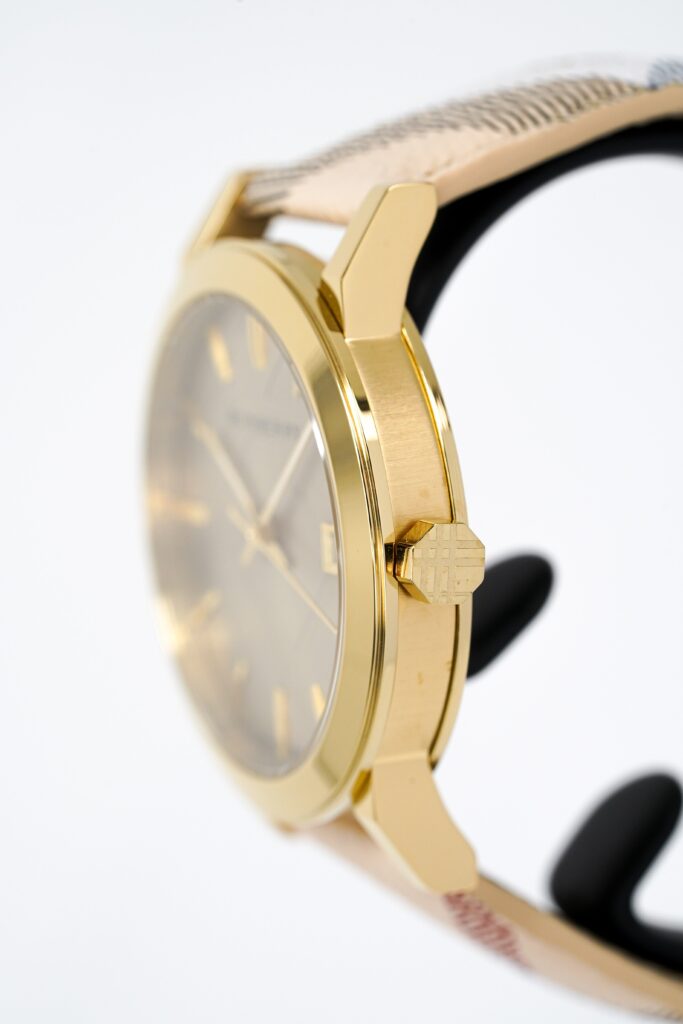 Introducing the Burberry BU9026, a unisex timepiece that embodies the brand’s commitment to elegance and precision. This watch features a 38mm gold-tone stainless steel case, offering a sleek and durable design.