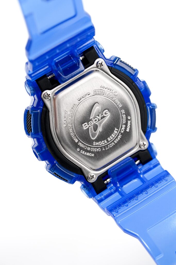 46.3mm x 43.4mm x 14.9mm Translucent Blue Resin and Stainless Steel Case. Characteristic Shock-Proof Case with Easy to Press Button Arrangement