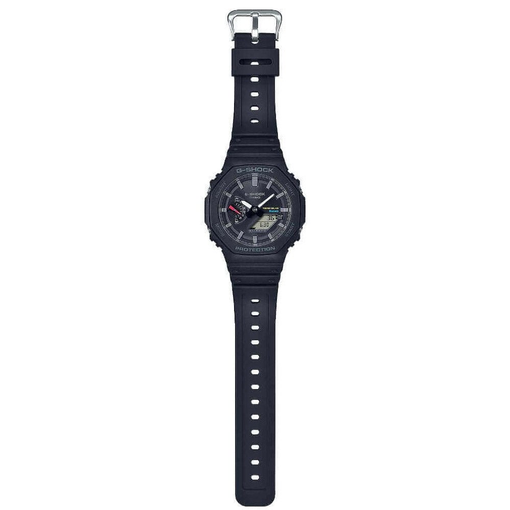 With Bluetooth® connectivity and a solar charging system, the new GA-B2100 shock-resistant watches take the iconic 2100 series to a whole other level. The Tough Solar charging system effectively converts light from any light source to power the watch, eliminating the need to replace the battery, and Smartphone pairing via Bluetooth® delivers accurate timekeeping. Combining the Carbon Core Guard structure, which protects the module and provides both shock resistance and a compact case, with G-SHOCK classic colours first used in the G-SHOCK 5600 models enables you to wear the latest, and the greatest G-SHOCK has to offer. GA-B2100-1AER has classic black styling with a white LCD.