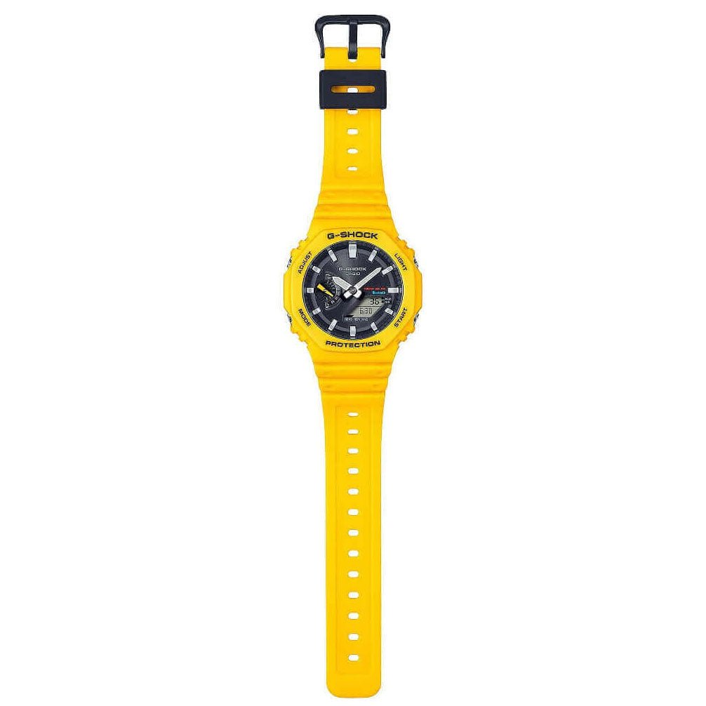 With Bluetooth® connectivity and a solar charging system, the new GA-B2100 shock-resistant watches take the iconic 2100 series to a whole other level. The Tough Solar charging system effectively converts light from any light source to power the watch, eliminating the need to replace the battery, and Smartphone pairing via Bluetooth® delivers accurate timekeeping. Combining the Carbon Core Guard structure, which protects the module and provides both shock resistance and a compact case, with G-SHOCK classic colours first used in the G-SHOCK 5600 models enables you to wear the latest, and the greatest G-SHOCK has to offer. GA-B2100C-9AER is a stand out yellow colour, styled to be noticed.