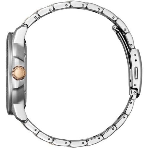 Two-tone (silver/rose gold)Â stainless steel case and bracelet with black elapsed time bezel. Silver push-button release clasp.Â