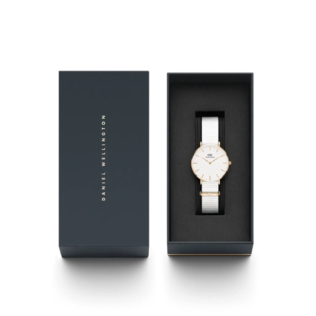 The Daniel Wellington Ladies Petite Dover White Watch DW00100313 is a beautifully crafted timepiece that exudes summer elegance. Inspired by the iconic white cliffs of Dover, this watch features an eggshell-white dial and rose gold details that perfectly complement the all-white NATO strap. The minimalist design and subtle color palette make it a versatile accessory that can be dressed up or down, capturing the essence of a classic, timeless look. Powered by a reliable Japanese Quartz movement, this watch ensures precision and style, while the interchangeable strap feature allows for personalised customisation.