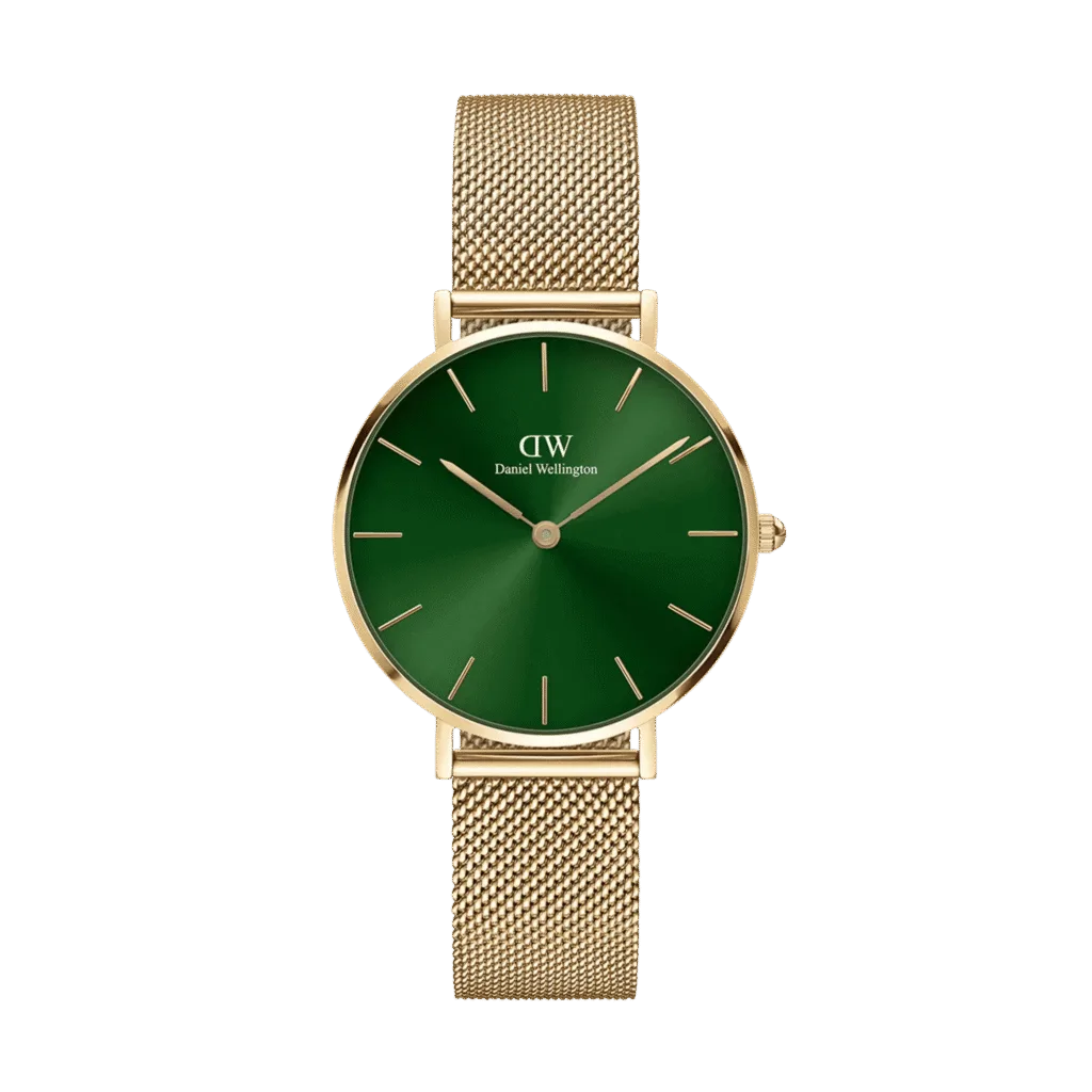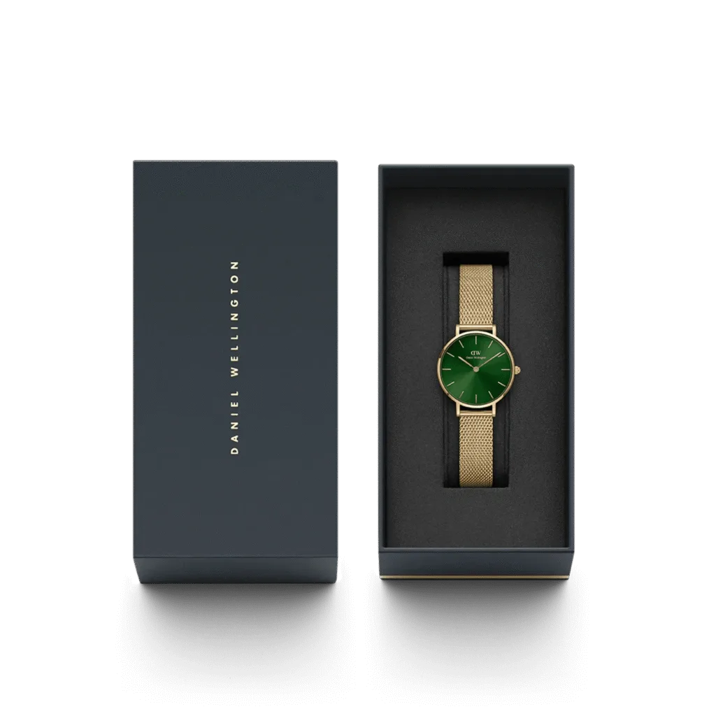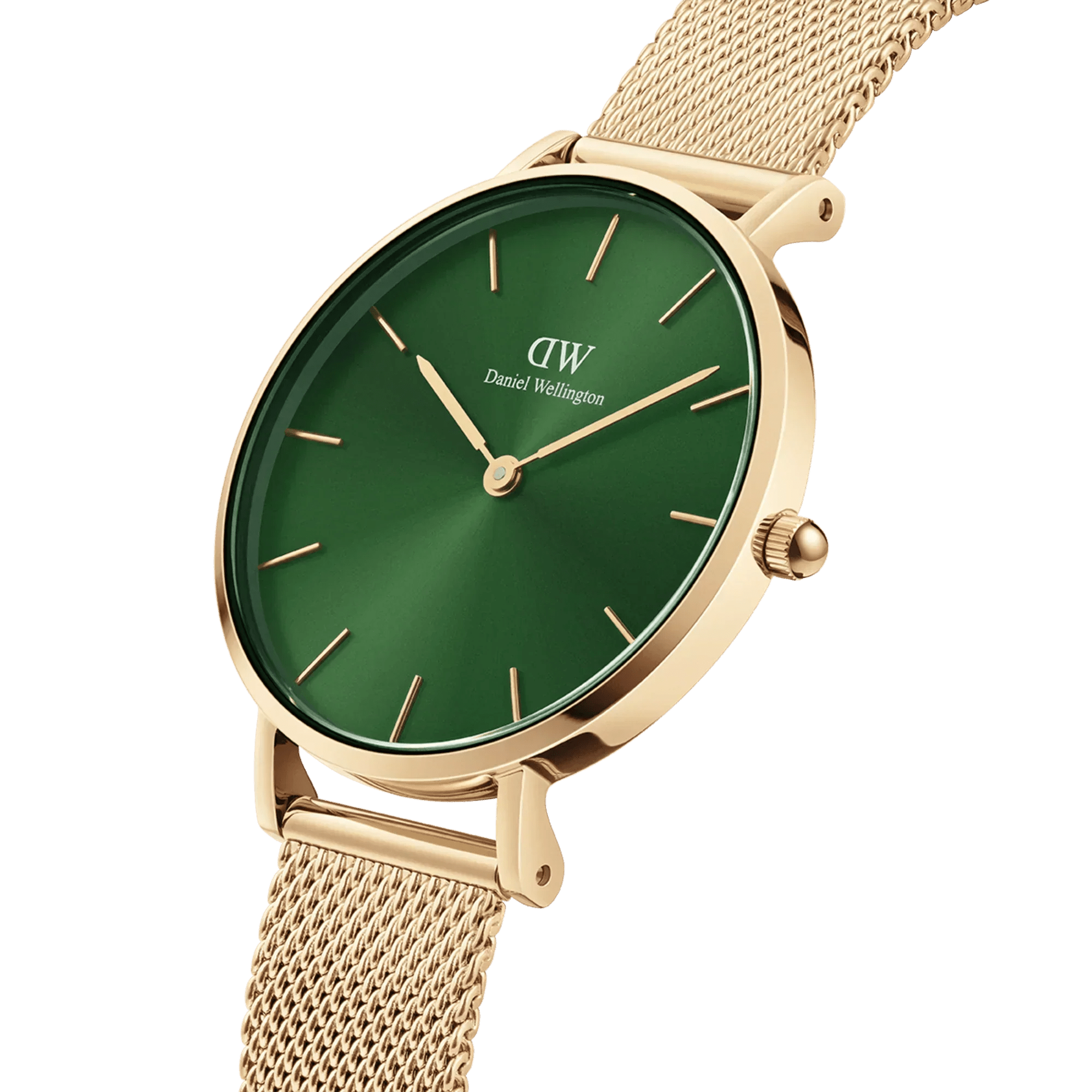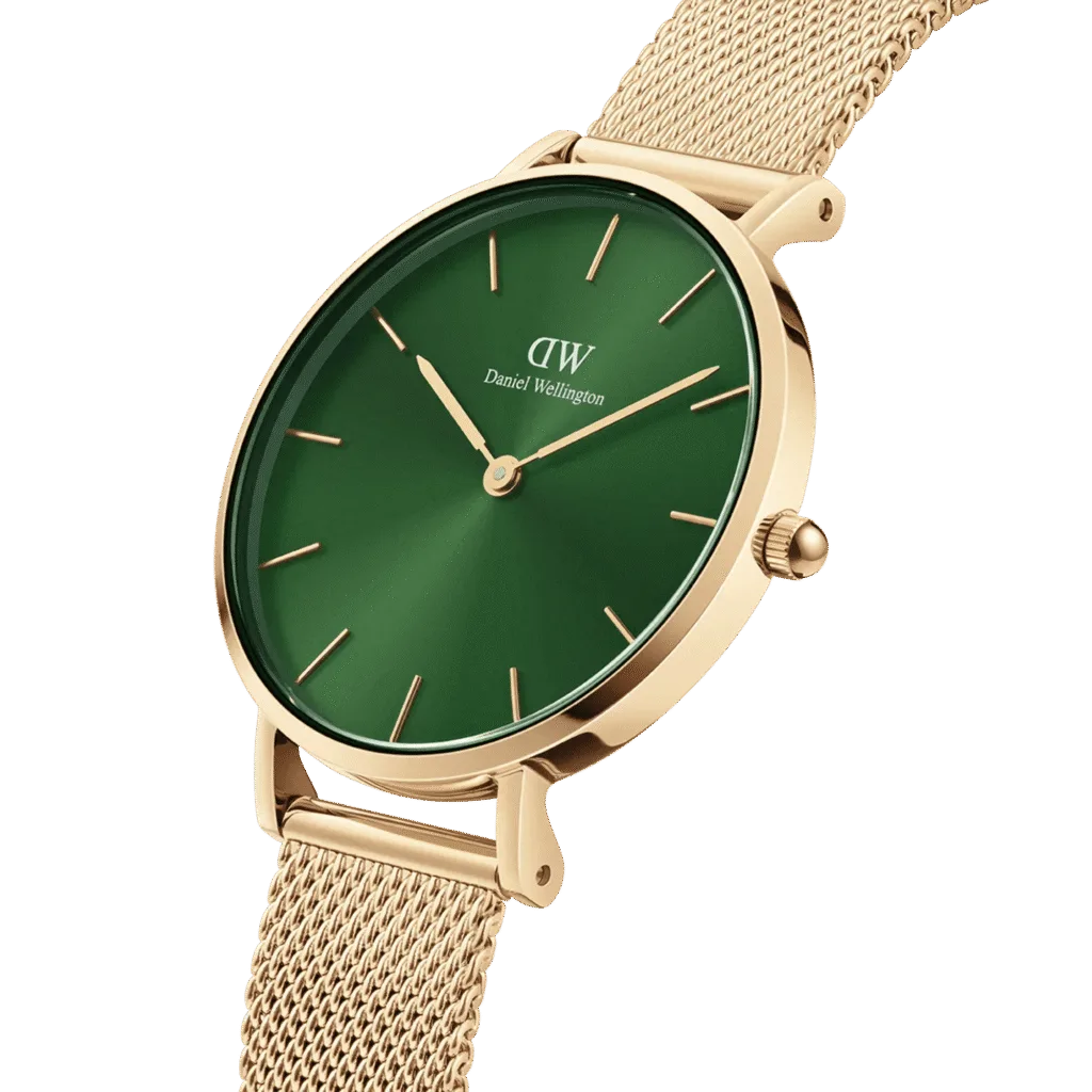 The dial of the Petite Emerald has a sunray finish and is dark green in color. a hue associated with harmony, balance, and good fortune. Made from polished stainless steel and offered in a sophisticated gold plating. a striking watch that adds something special to your appearance.