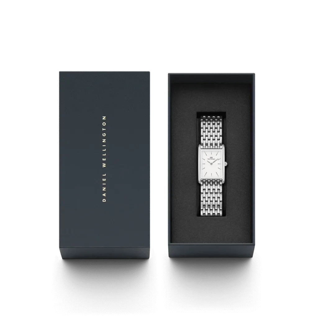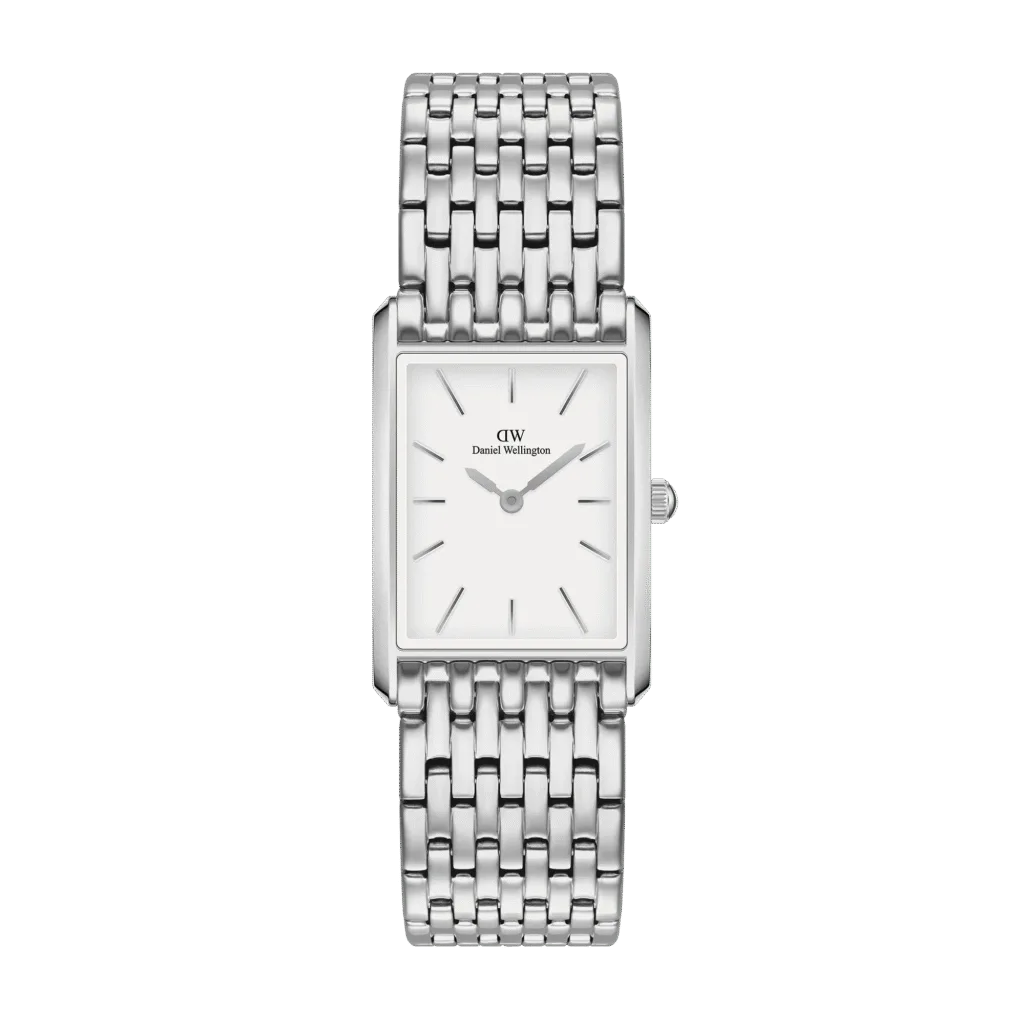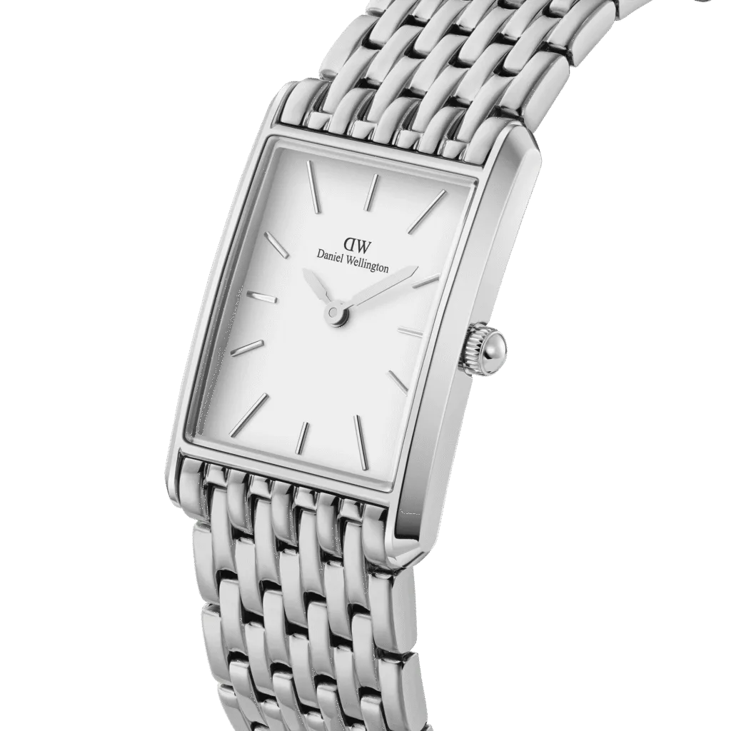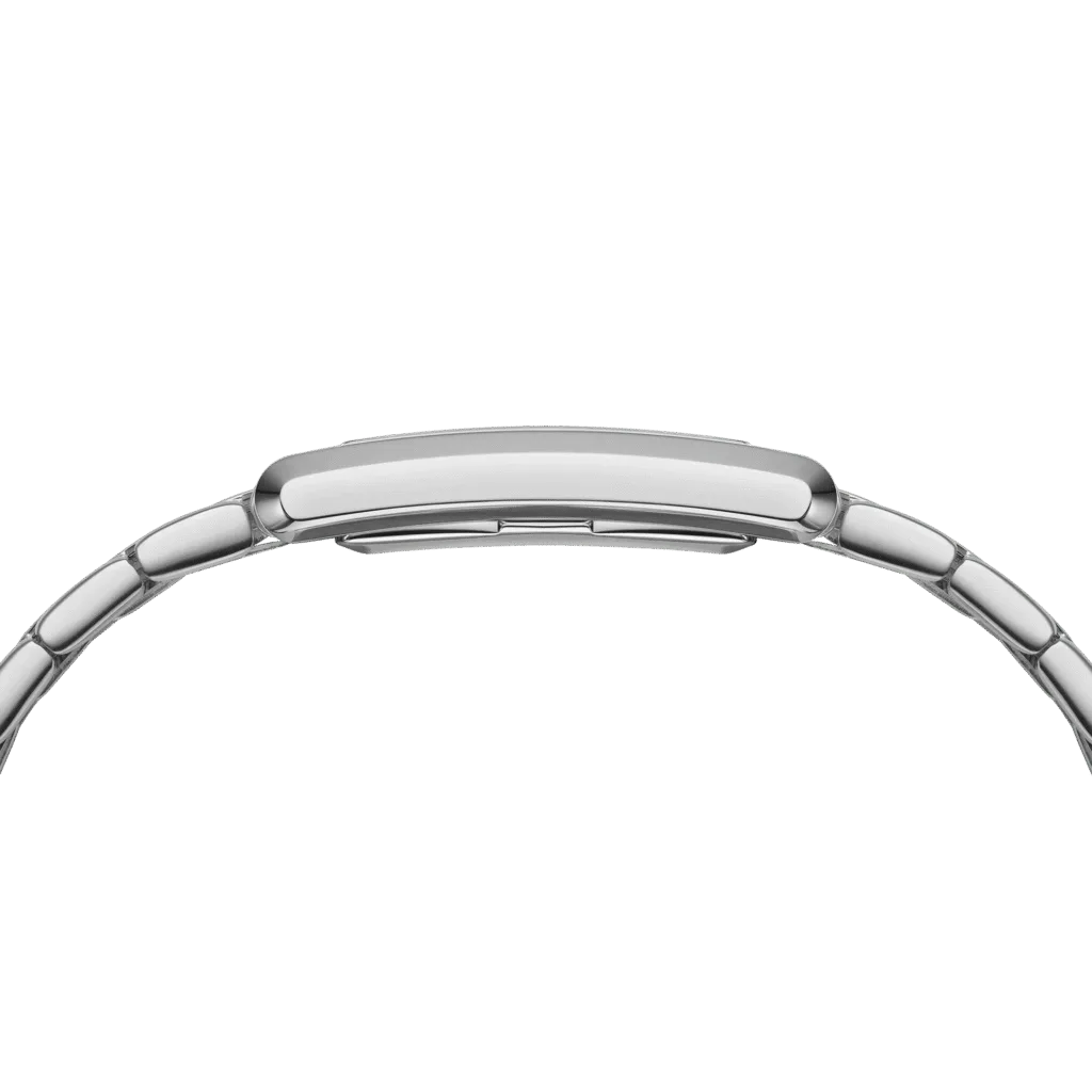 The Bound collection perfectly symmetry your wrist. This silver watch’s curved rectangular case and 9-link strap are precisely the same width, giving the dial a seamless integration.