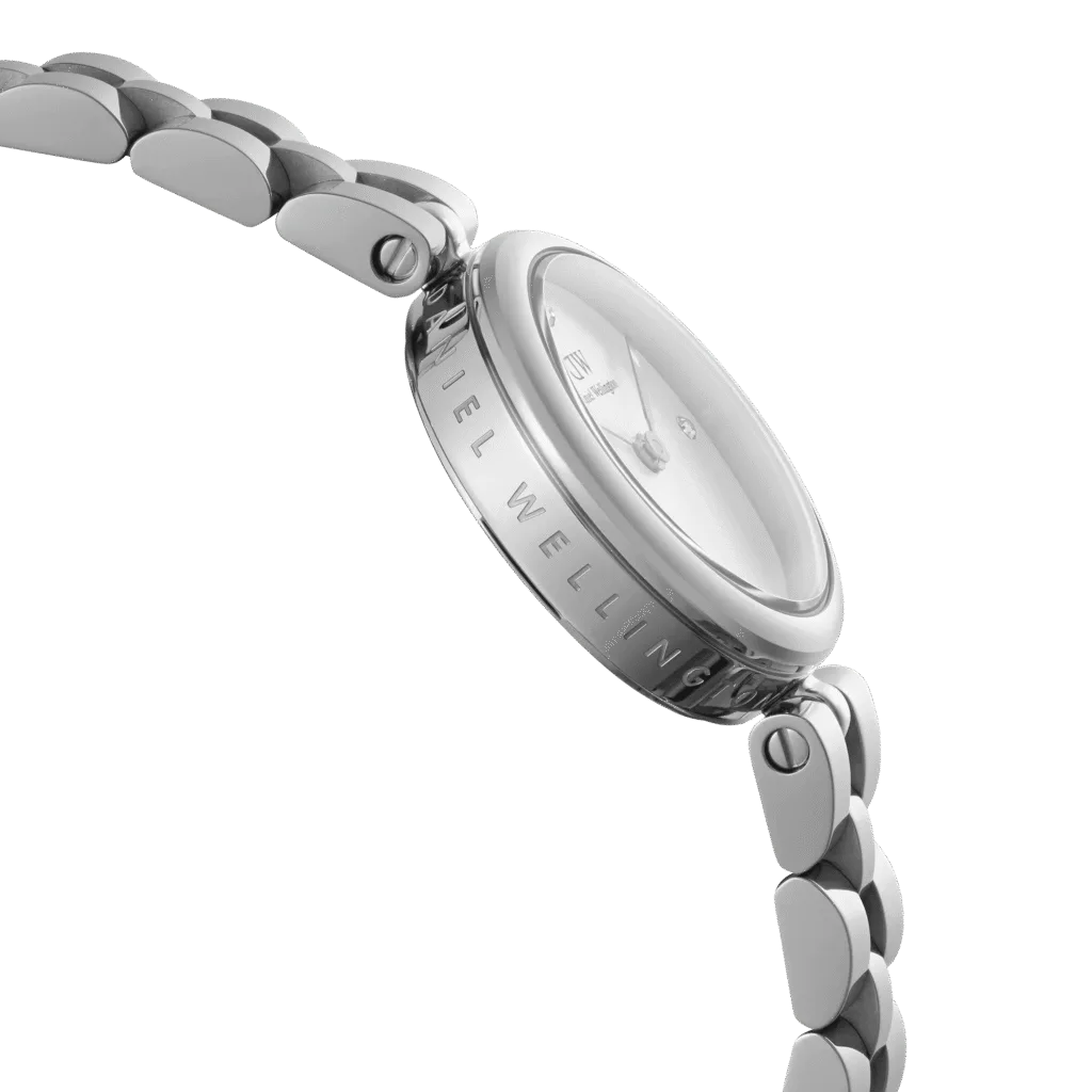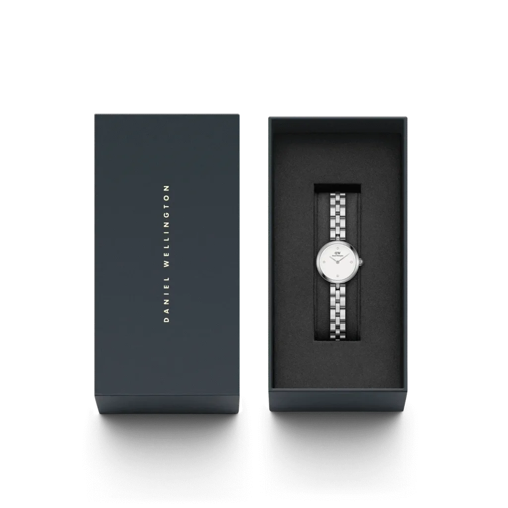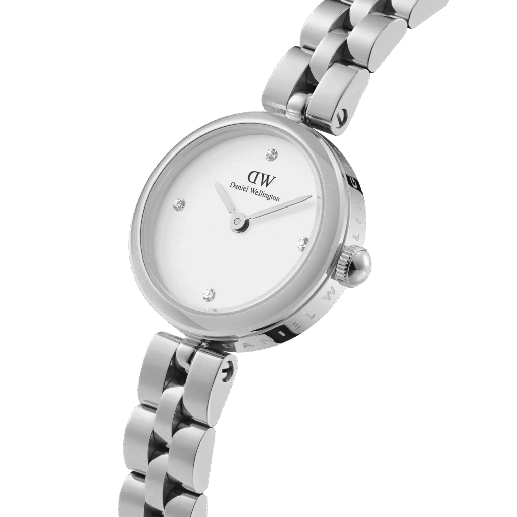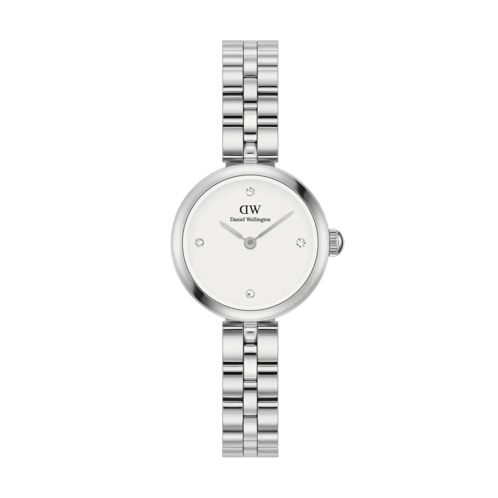 Elan Lumine, the first item to combine elements of our watch and jewelry collections, has a nameake piece’s delicate silhouette and logo design elements. has a white dial with crystals scattered across a silver 3-link strap.