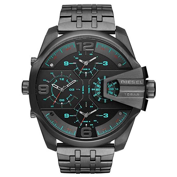 The Diesel DZ7372 features a robust 57mm stainless steel case paired with a sleek black dial that includes dual time zone displays and chronograph subdials. The watch is powered by a reliable quartz movement, ensuring precise timekeeping. Its water resistance up to 30 meters adds practicality, making it suitable for everyday wear.